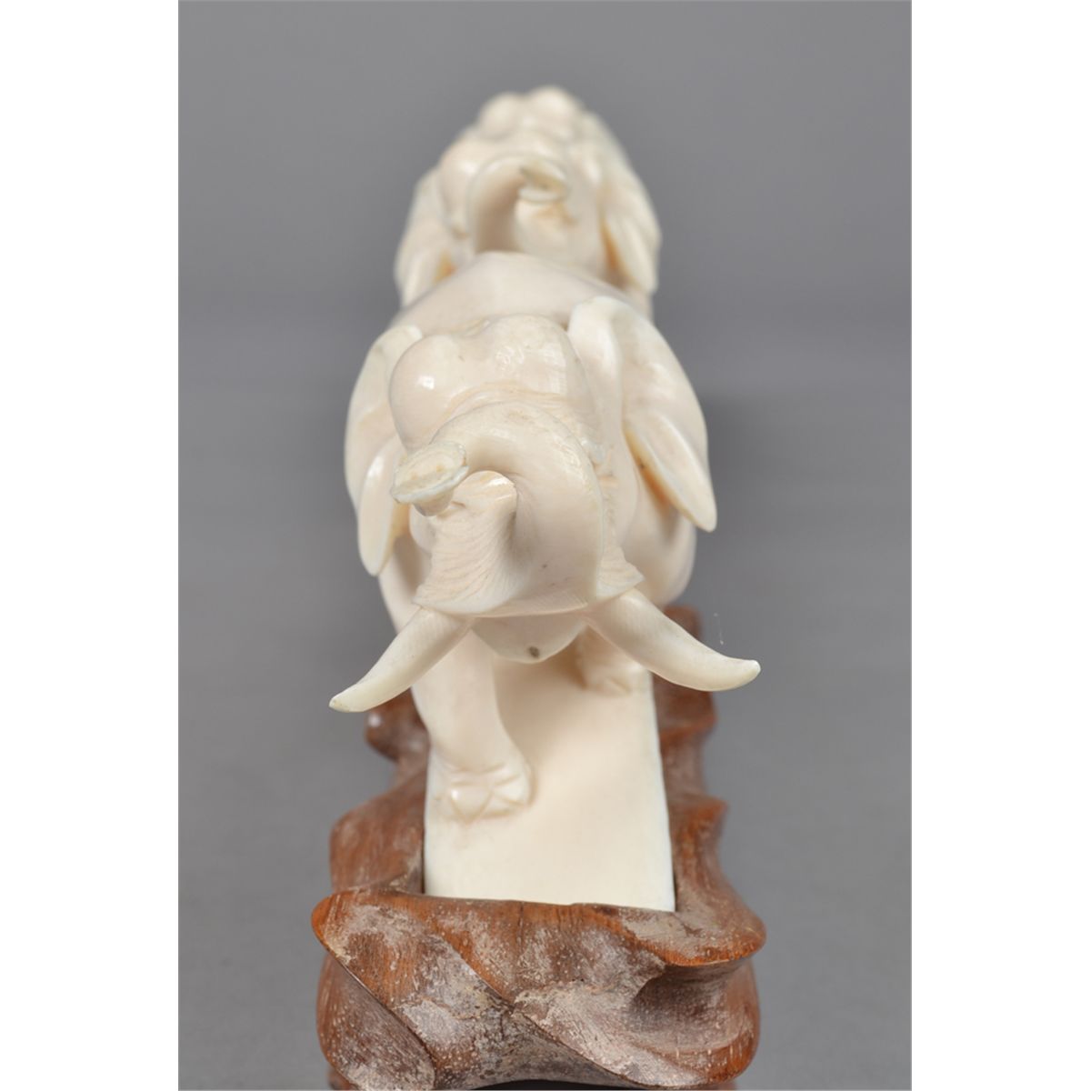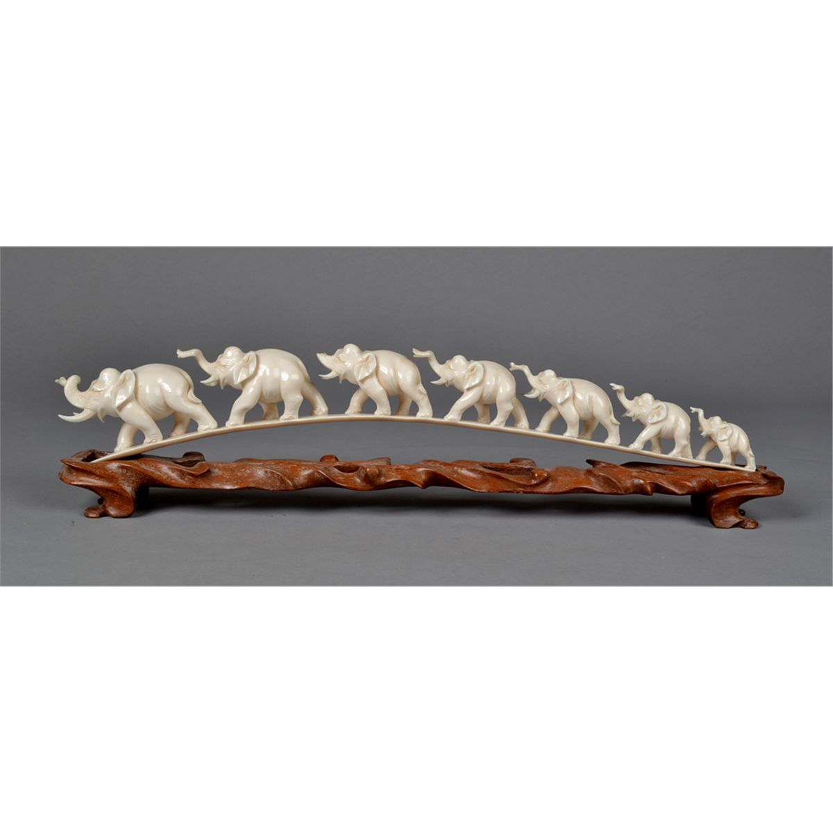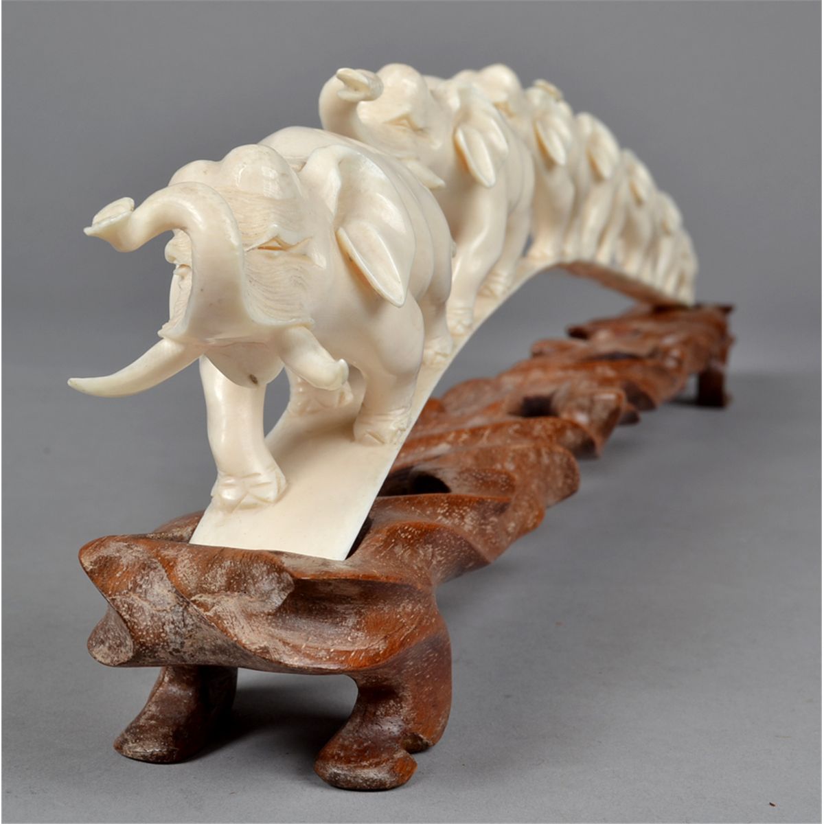 Finely carved and polished in graduating sizes, all with raised trunks, mounted on carved openwork hardwood base. 16" L, not including the stand. Circa early 20th century. One elephant with loss to tusk. Private collection Lapeer, MI.
