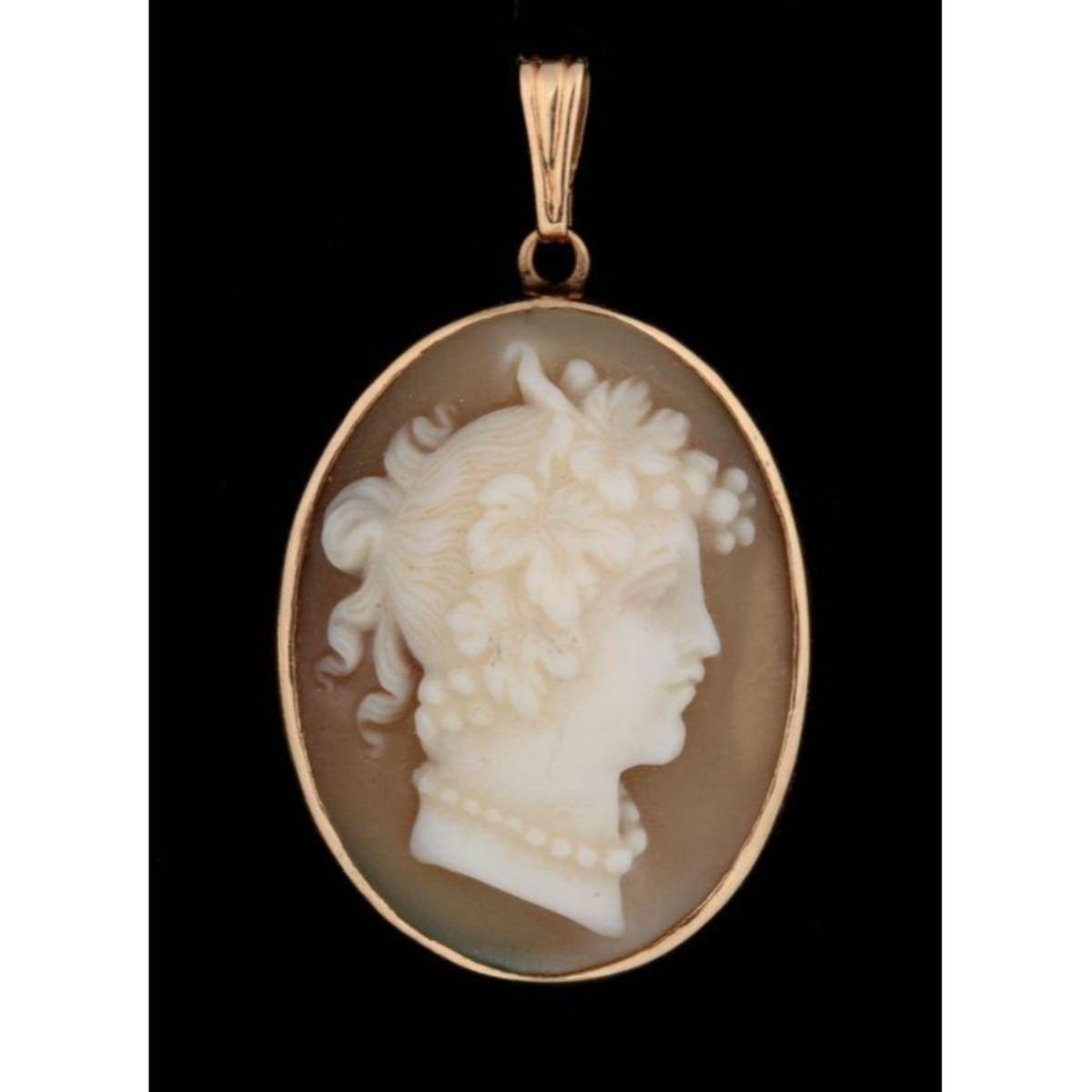 A good classical bust carved shell brooch in a setting marked 14k, measures 1.125 x .625 inches with the bail, weighs 2.8 grams. Very good condition.