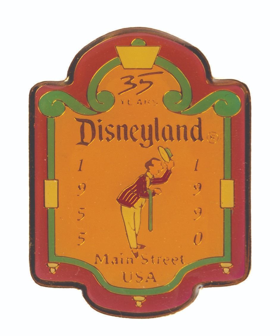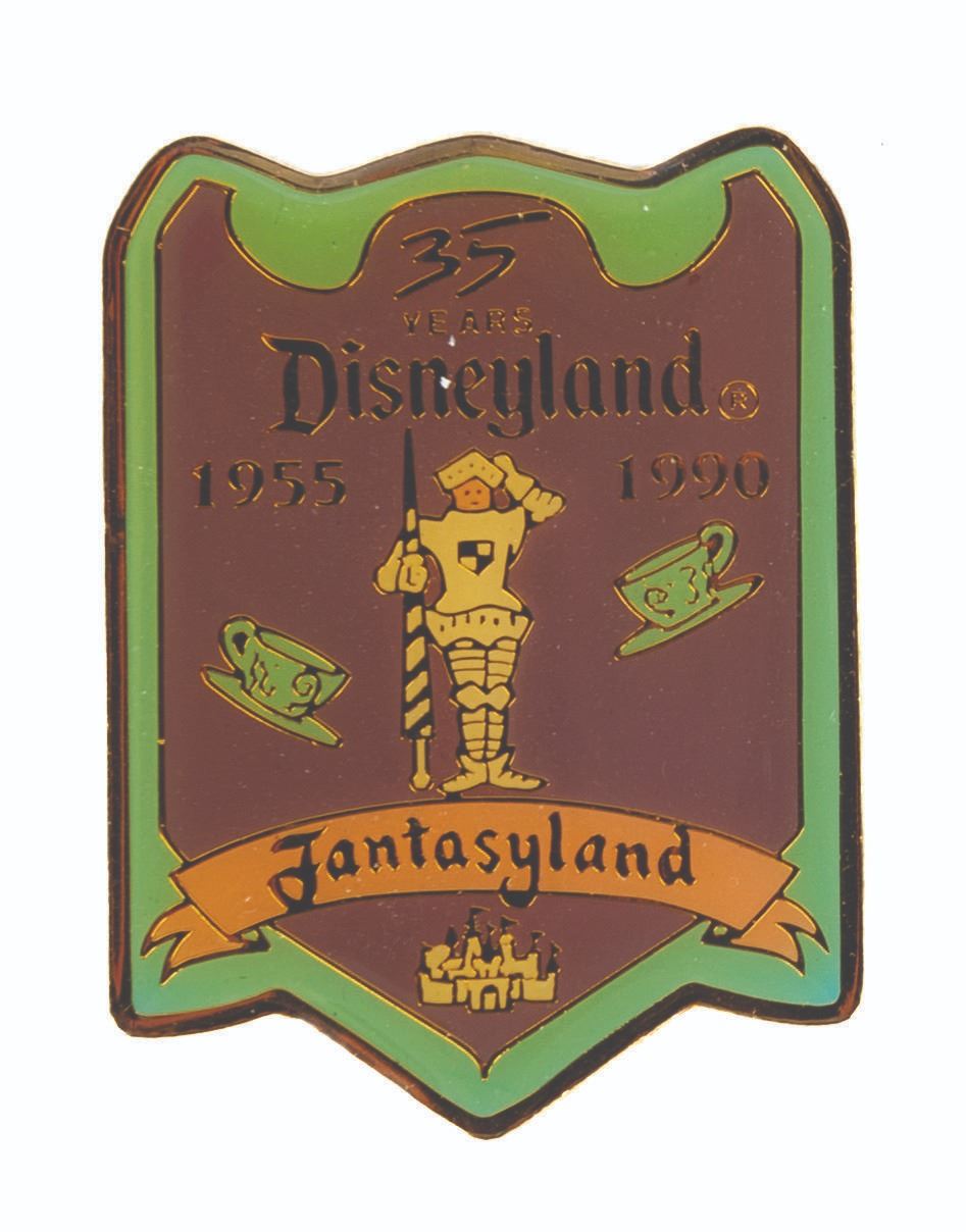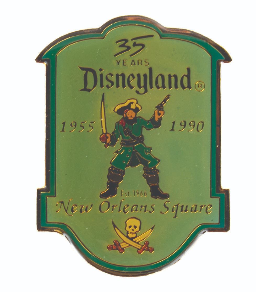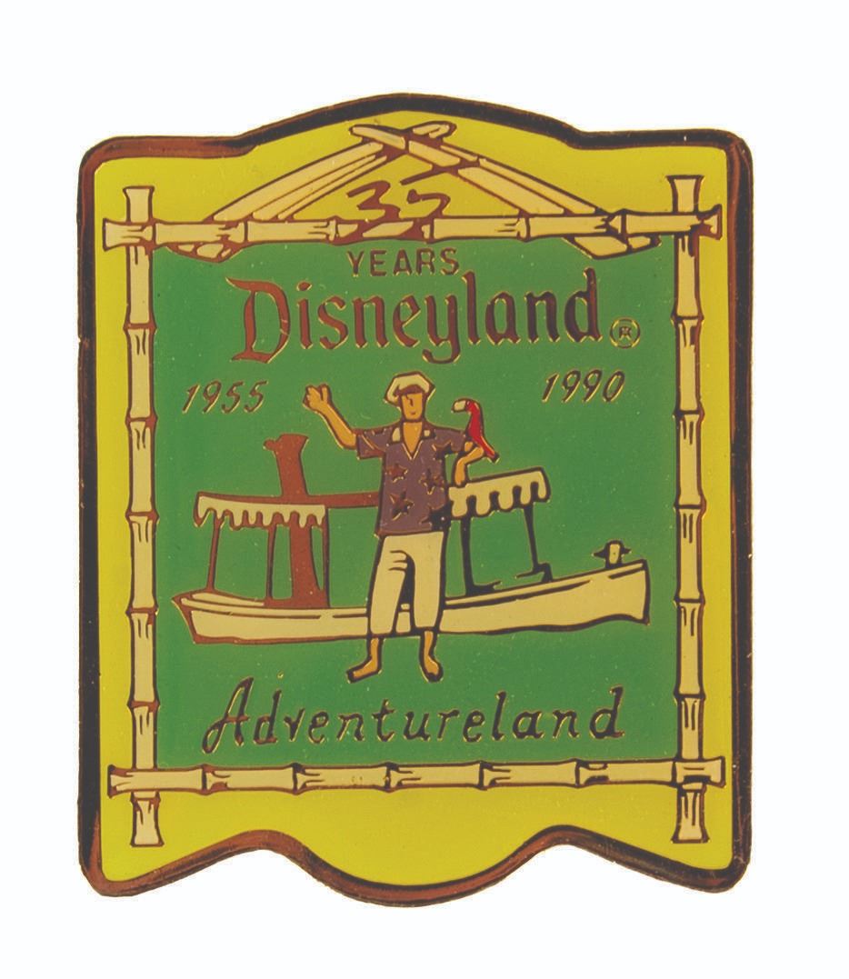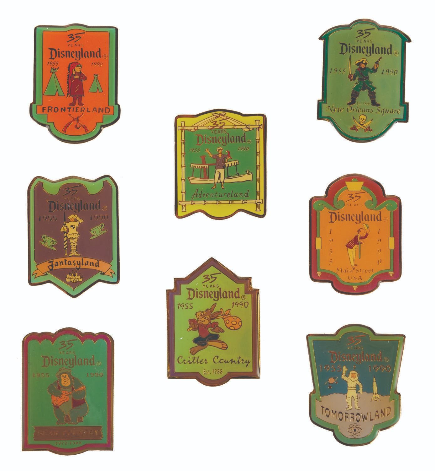 (Disneyland, 1990) A rare Cast Member exclusive eight-pin set commemorating the 35th anniversary of Disneyland with pins for Main Street, Adventureland, Frontierland, Fantasyland, Tomorrowland, New Orleans Square, Bear Country, and Critter Country. Each measuring 1.75” x 1.5”, the pins are in overall fine condition with typical discoloration from age.