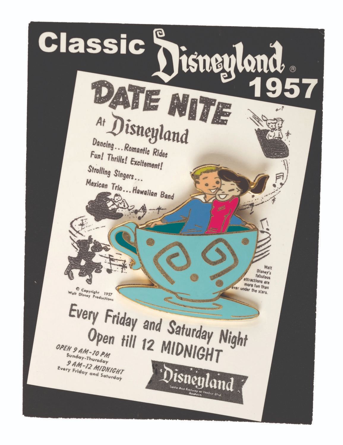 (Disneyland, 2001) A Cast Member exclusive Date Nite at Disneyland pin featuring a retro-style couple taking a spin on the Mad Tea Party in 1957. The limited-edition pin measures 1.5" x 1.5" and is in fine condition.