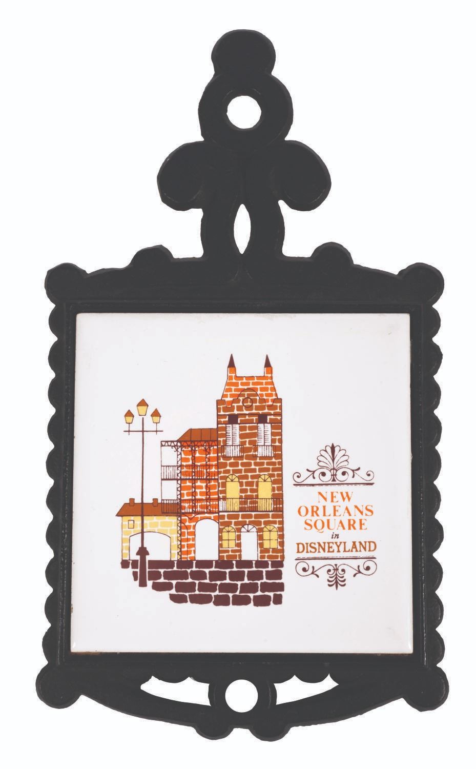 (Disneyland, 1960s) A decorative cast iron and tile trivet featuring four-color imagery of New Orleans Square. Measuring 5" x 9.25", the trivet is in very good condition, with surface wear on the front and scuffs on the iron back.