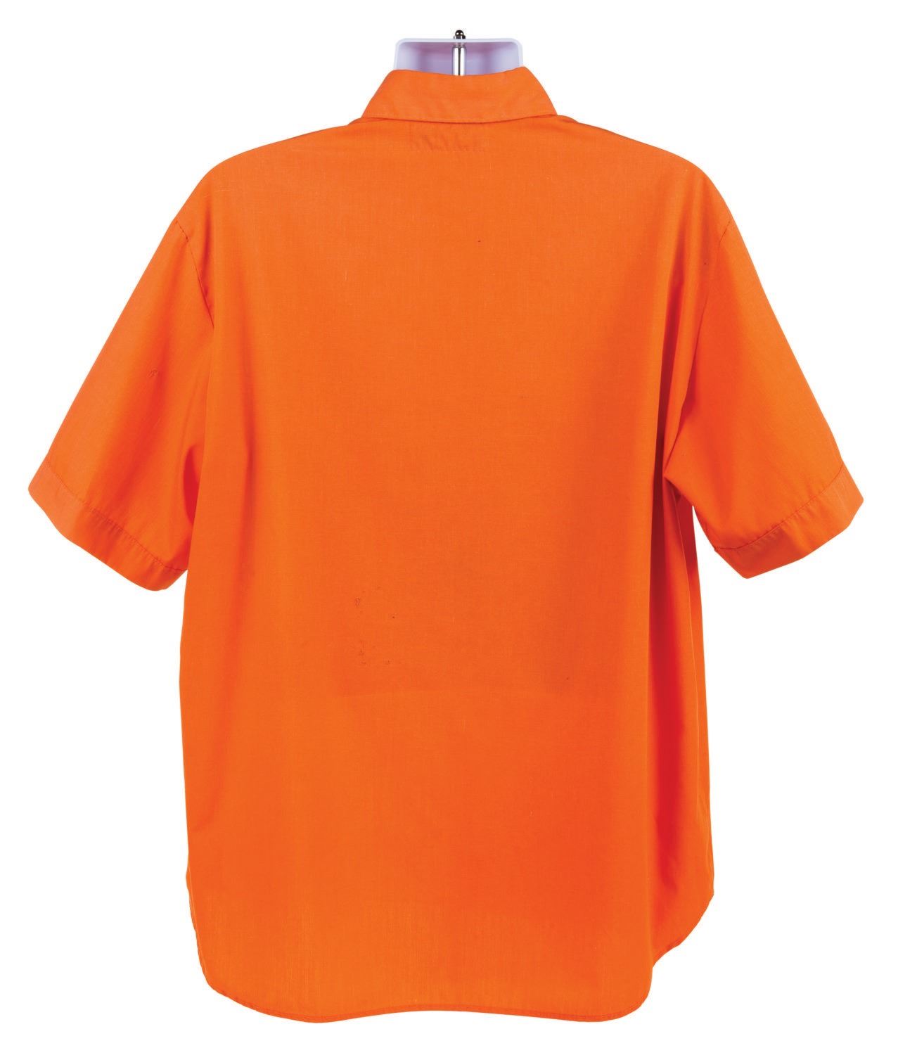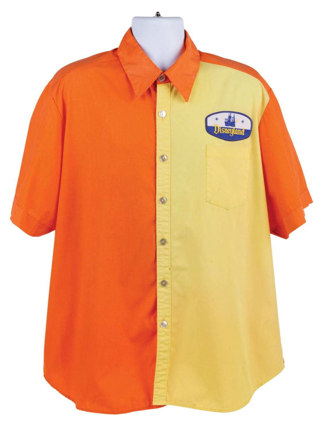 (Disneyland, 1980s) A 1980s Disneyland Cast Member wardrobe orange and yellow shirt, with a vintage Disneyland logo patch on the left breast. In size XL, the shirt is in very good Park-used condition, with light wear, and light fading to the color.