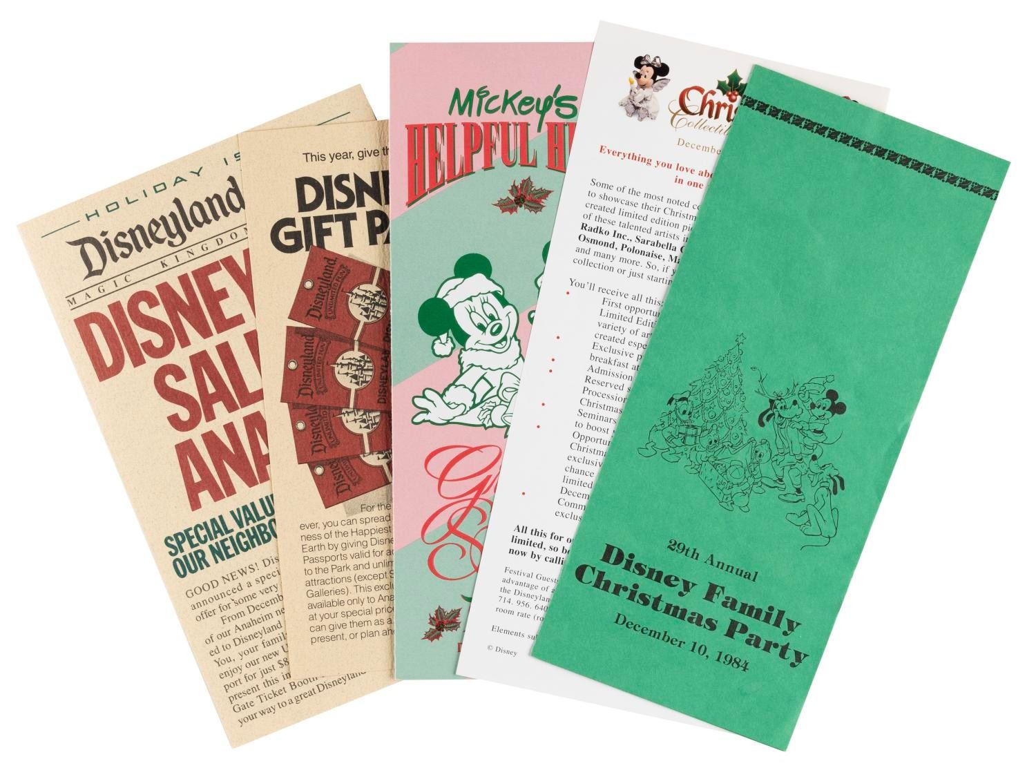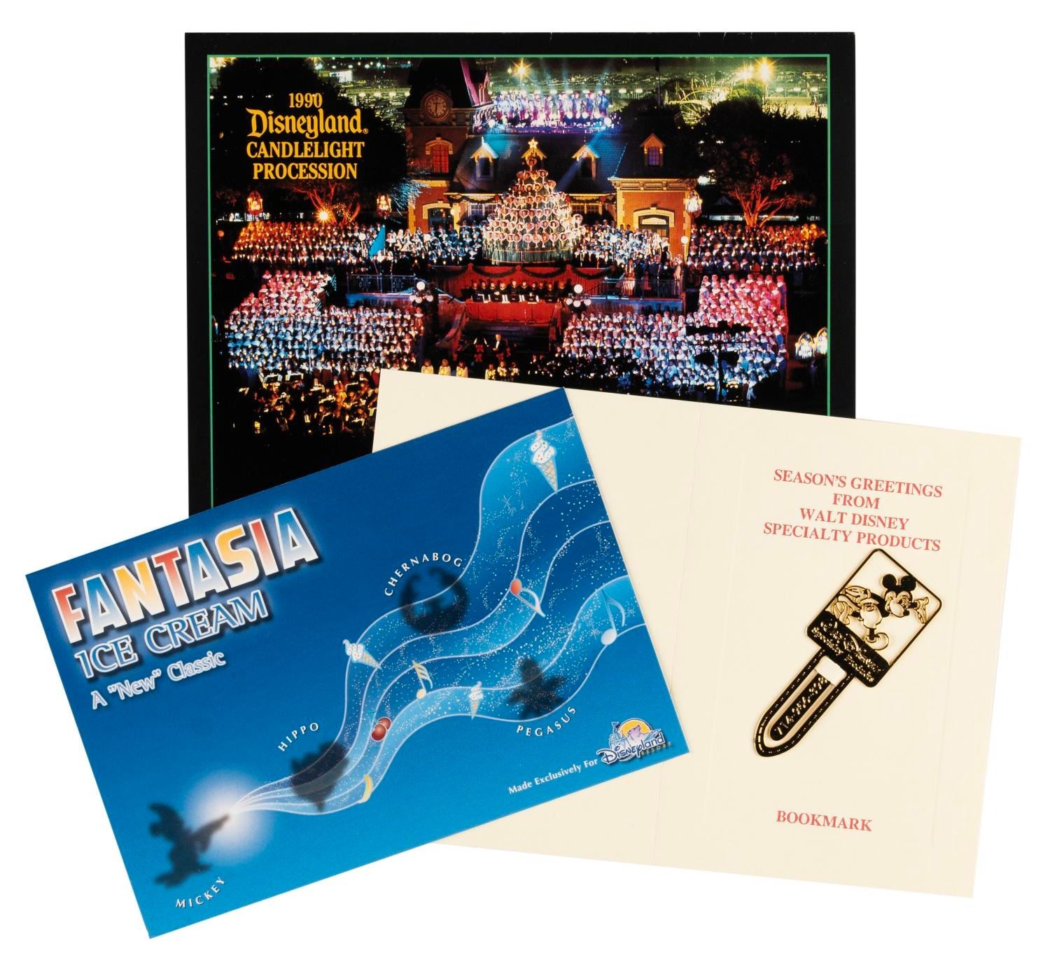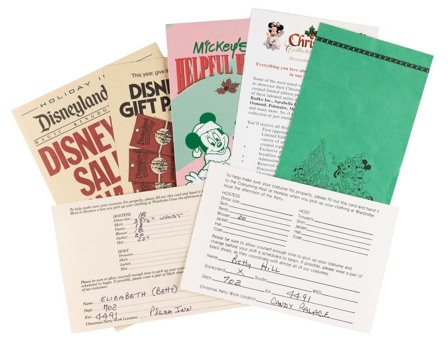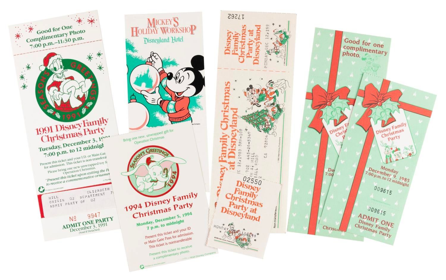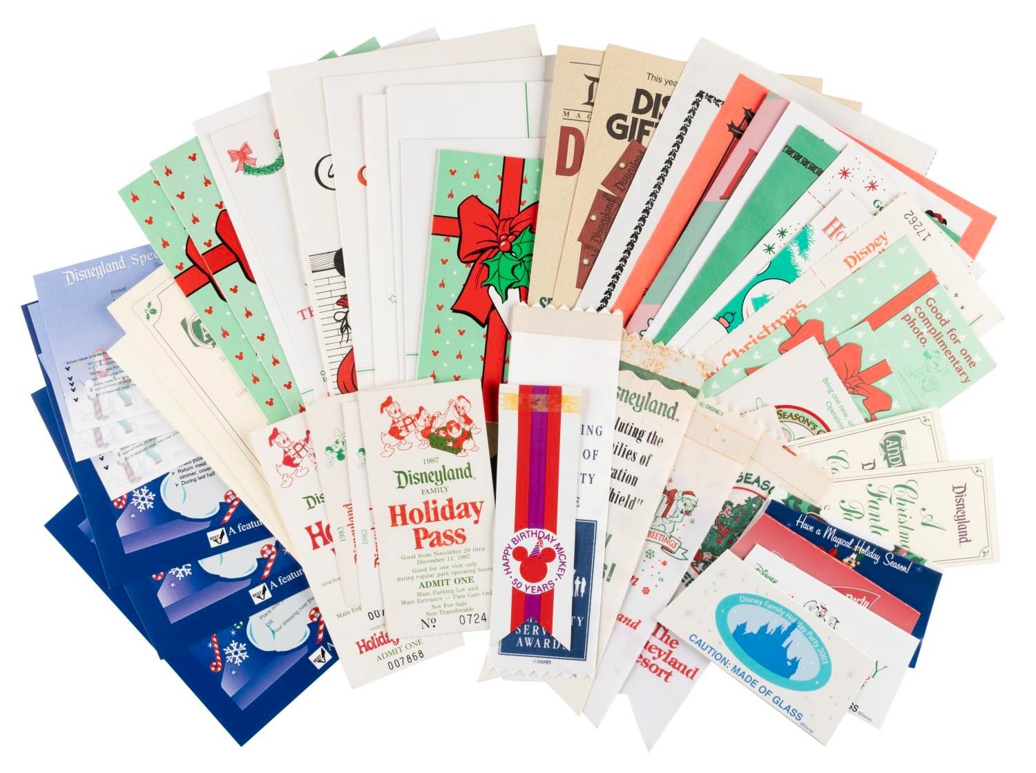 (Disneyland, 1980s-2000s) A collection of 56 Disneyland Cast Member Christmas ephemera including Family Party invites and tickets, flyers, recipes, and unused ribbons that would be added to name badges, including one saluting families of Operation Desert Shield. Also included is a gold-colored metal gift bookmark with a card from Walt Disney Specialty Products. The items range from good to fine condition, with some showing wear from use including names and information noted in them, and the Desert Shield ribbon showing some spotting from age.