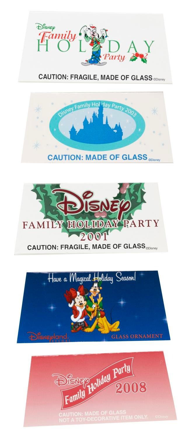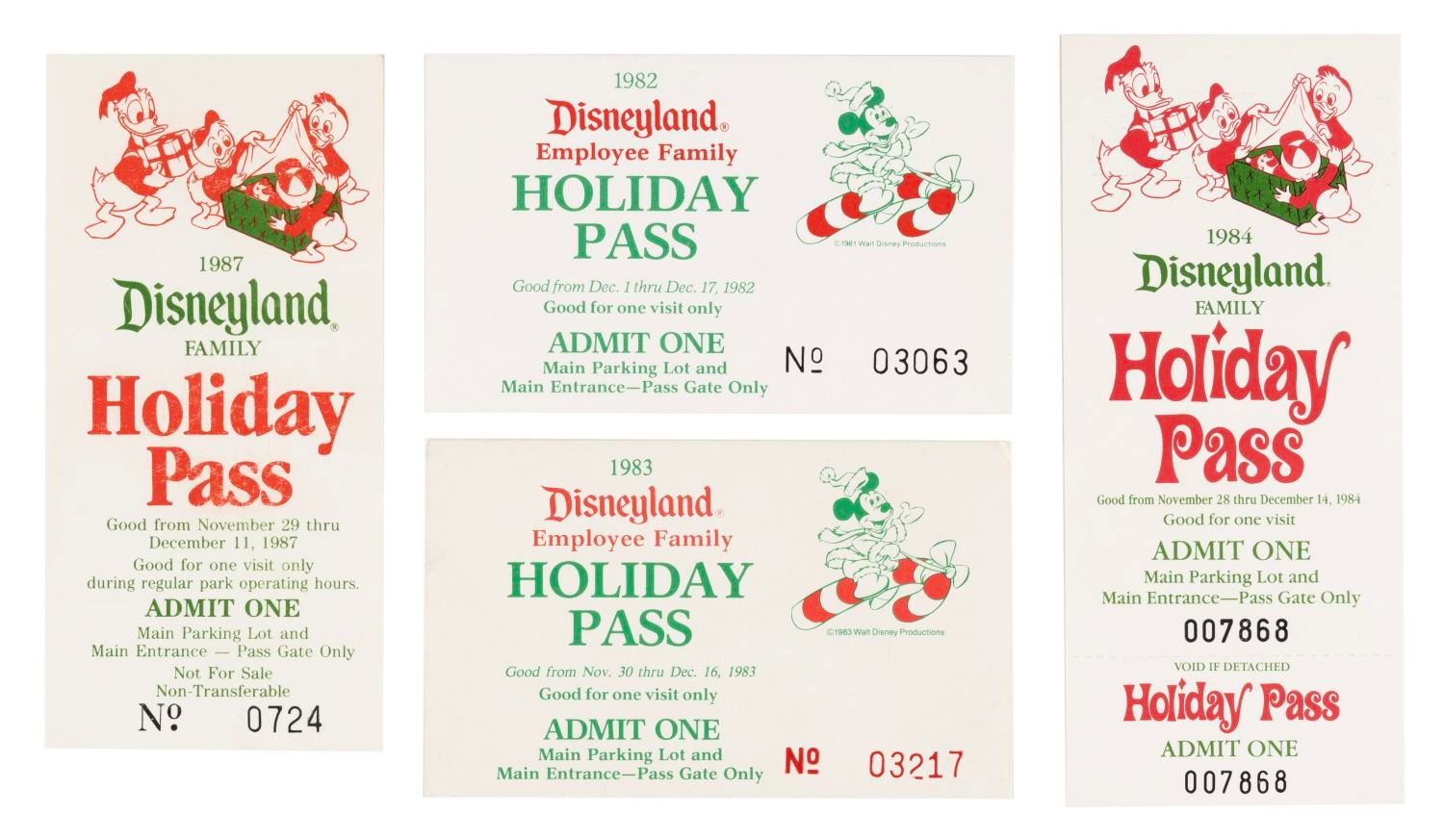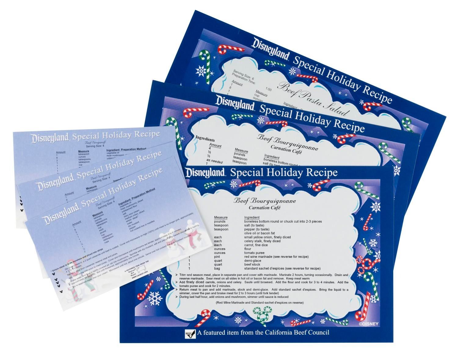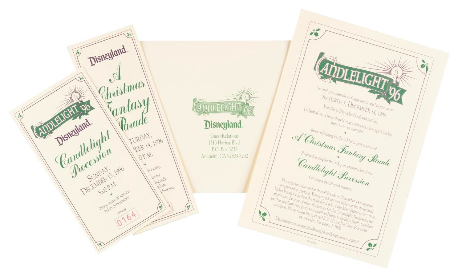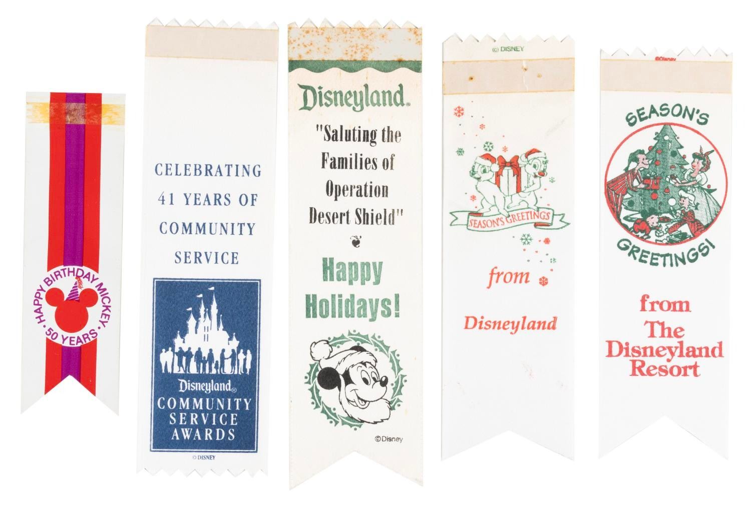 (Disneyland, 1980s-2000s) A collection of 56 Disneyland Cast Member Christmas ephemera including Family Party invites and tickets, flyers, recipes, and unused ribbons that would be added to name badges, including one saluting families of Operation Desert Shield. Also included is a gold-colored metal gift bookmark with a card from Walt Disney Specialty Products. The items range from good to fine condition, with some showing wear from use including names and information noted in them, and the Desert Shield ribbon showing some spotting from age.