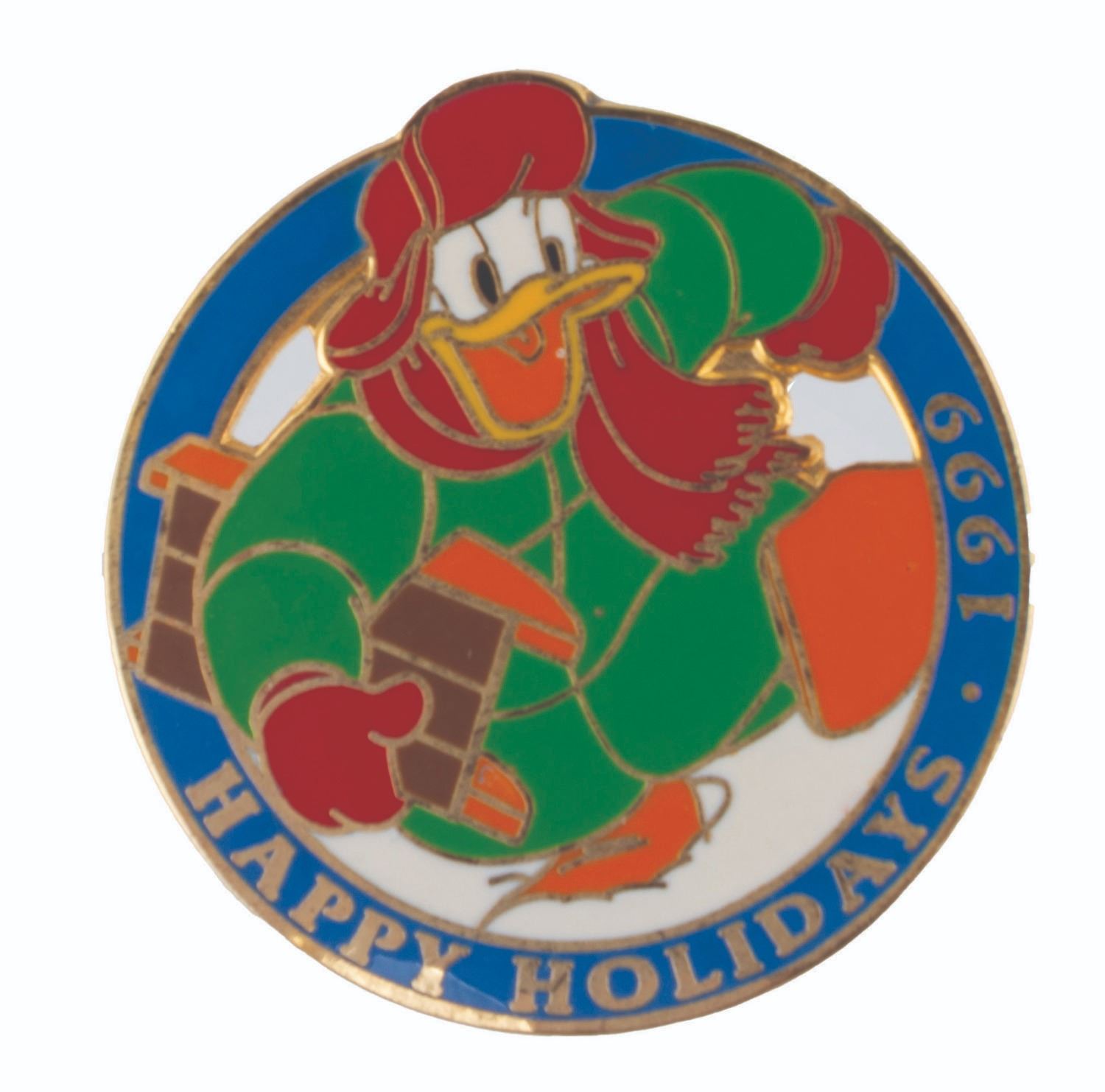 (Disneyland, 1999) A pin of Donald Duck in winter attire exclusive to Cast Members who work on Christmas. Measuring 1.25” in diameter, the pin is in fine condition.