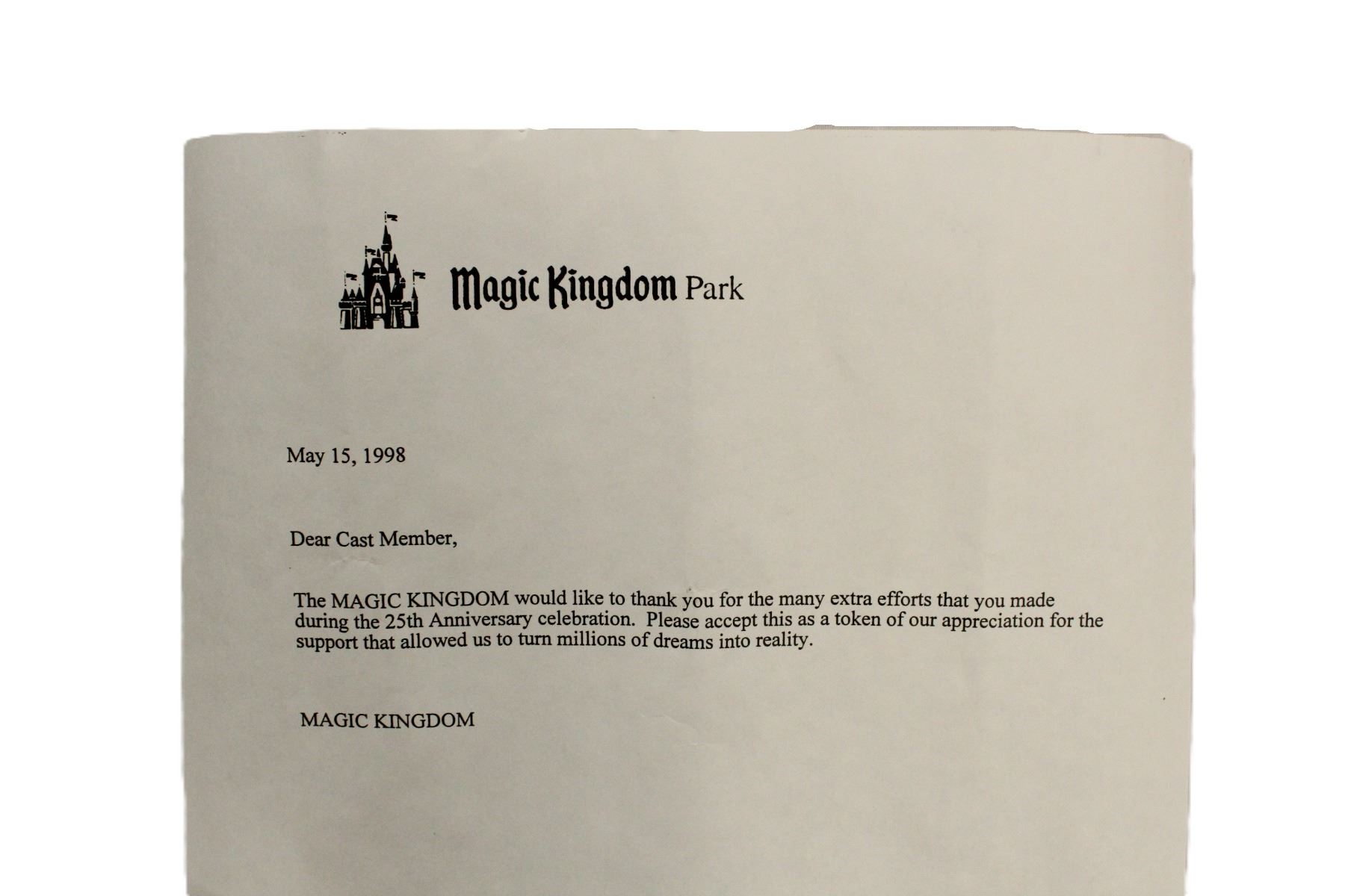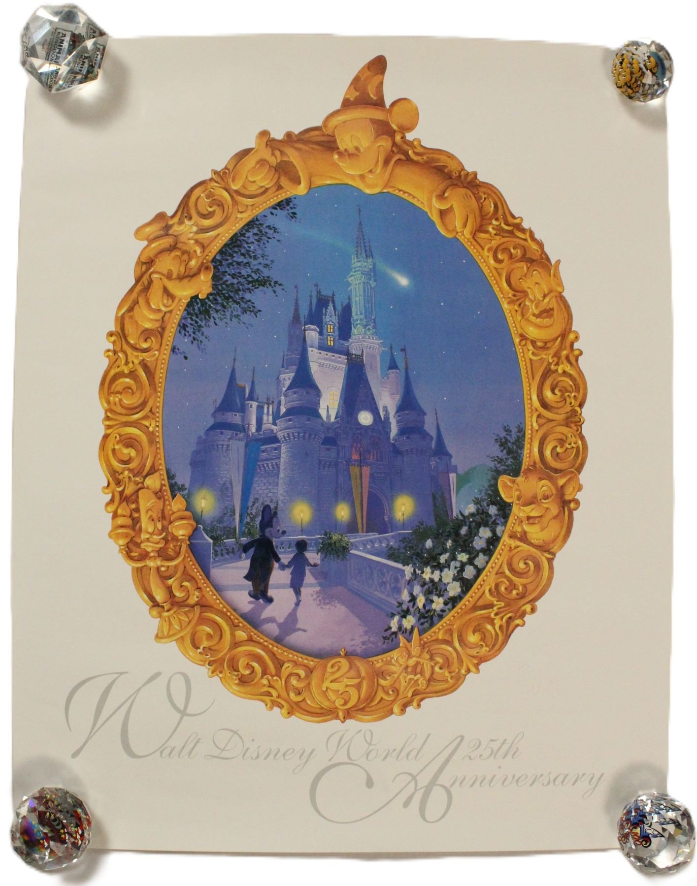 (Walt Disney World, 1996) This poster was presented to Magic Kingdom Cast Members for their part in helping with the 25th anniversary celebration of Wlat Disney World. The poster bears a 25th anniversary embossed stamp in the lower right corner. It measures 16" x 20". It also includes the original presentation letter. It is in new, rolled condition in its original plastic container.