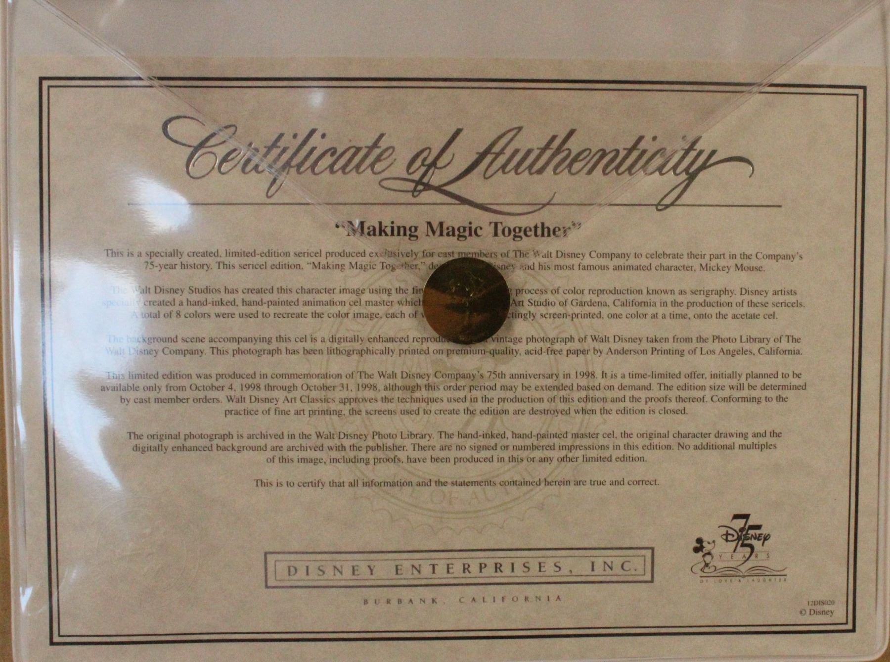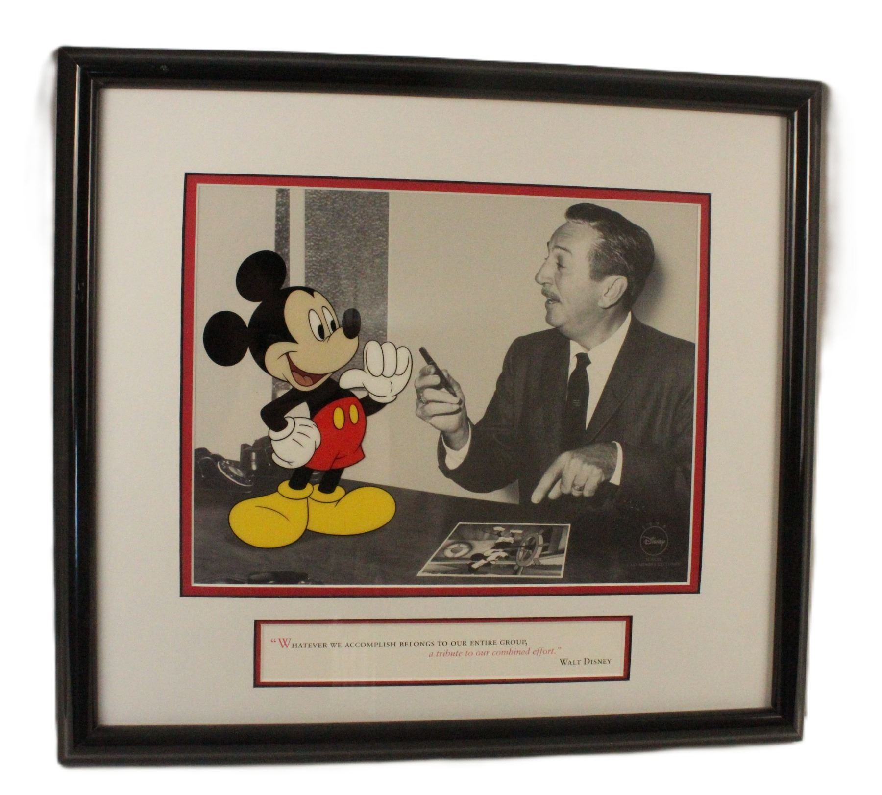 (Walt Disney, 1998) "Making Magic Together" Walt Disney with Mickey Mouse Cast Member Exclusive Sericel. "Whatever we accomplish belongs to our entire group, a tribute to our combined effort." -- Walt Disney. In 1998, the Walt Disney Company celebrated its 75th Anniversary. They produced this sericel of Walt asking Mickey Mouse for an autograph for this event, a piece never offered to the public, sold only to Studio employees from October 4 through October 31, 1998. The cel has a Cast Member seal and date, with Walt's quote matted separately under the main image. The mat's primary opening measures 12" x 9"; framed with Plexiglas for an overall size of 18" x 16". A Disney COA is on back of the frame. Employee Only art pieces are considered highly desirable. Frame sold as-is. It is in excellent condition.