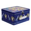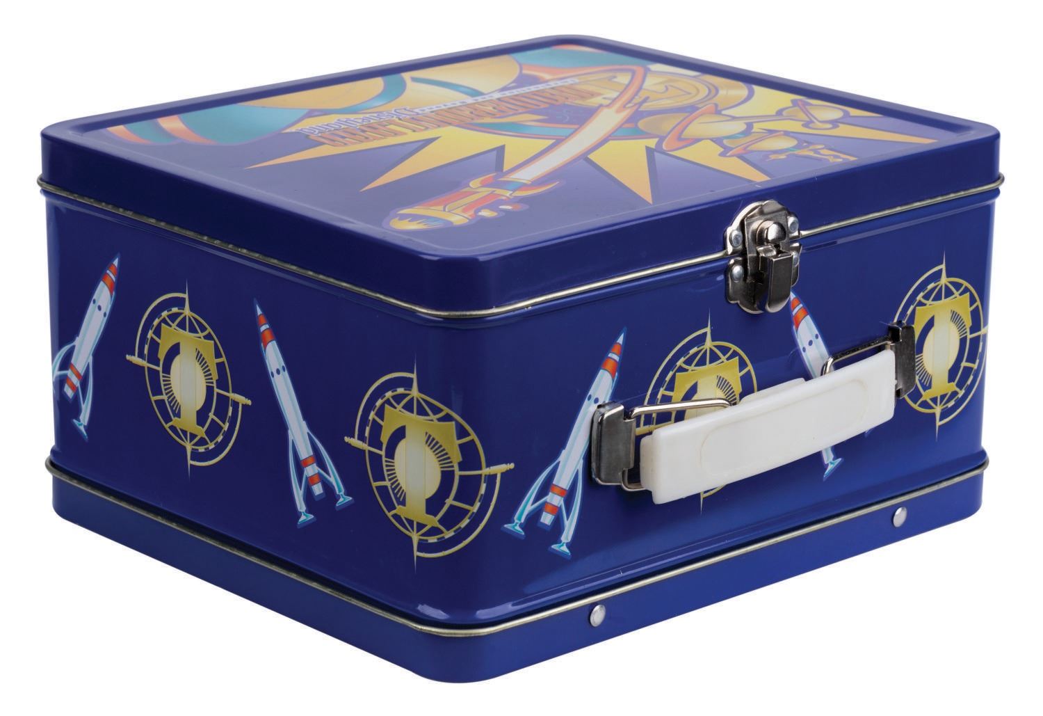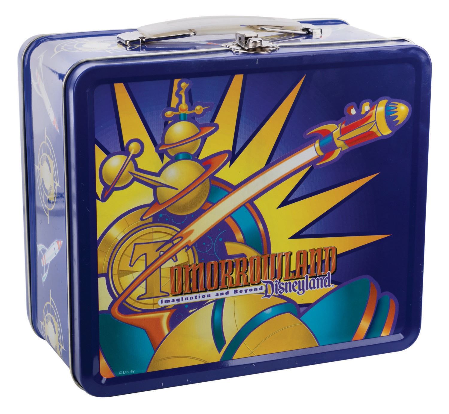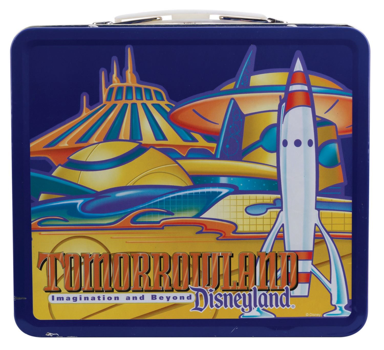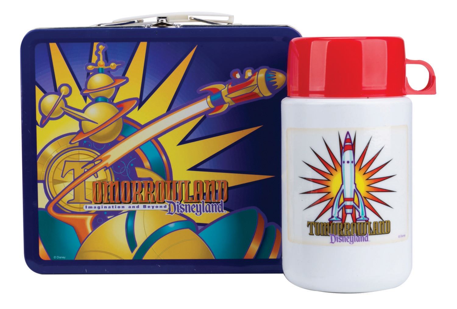 (Disneyland, 1998) A Cast Member Exclusive lunchbox and thermos celebrating New Tomorrowland at Disneyland. The plastic Thermos and metal lunchbox features imagery inspired by the dynamic murals of Walt Disney Imagineer Joe Spencer. Measuring 8"x7", and 7.75" tall, this retro-style pieces are in very good condition with a few scratches, minor spots of surface loss and scuffing from handling and age.