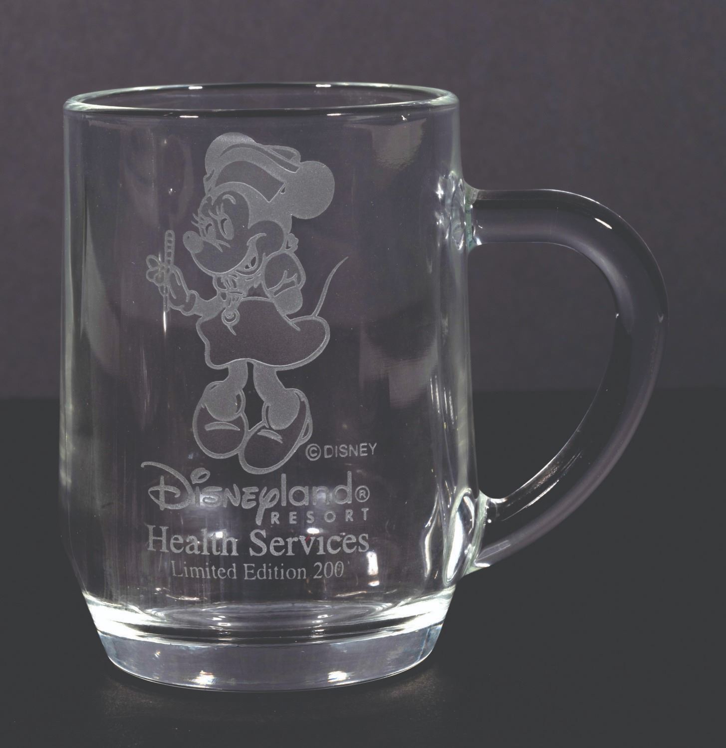 (Disneyland, 2000s) An etched Cast Member-exclusive Health Services glass mug featuring Minnie Mouse dressed as a nurse. Created in a limited edition of 200, the mug measures 4" tall and 3" in diameter and is in very good condition with light surface wear.