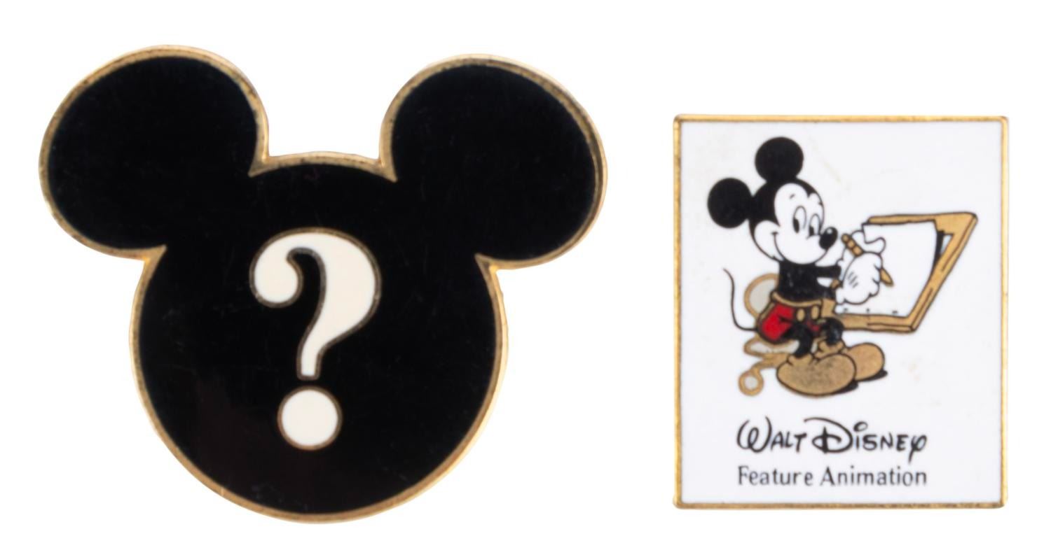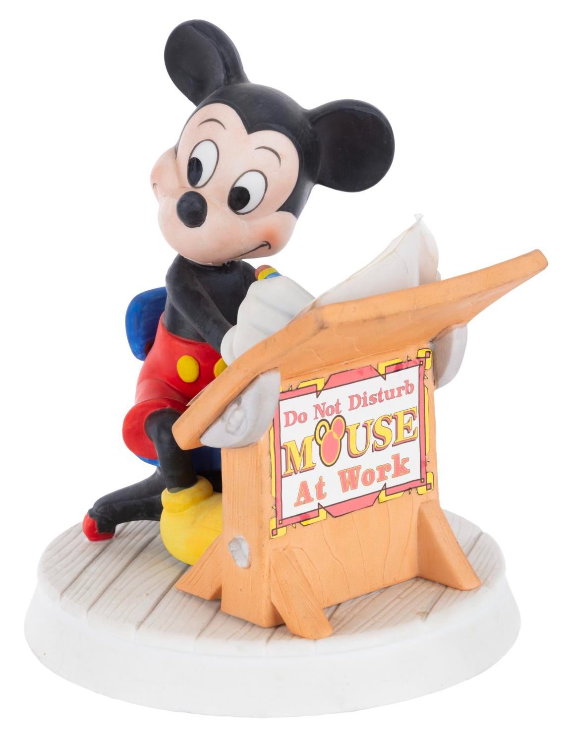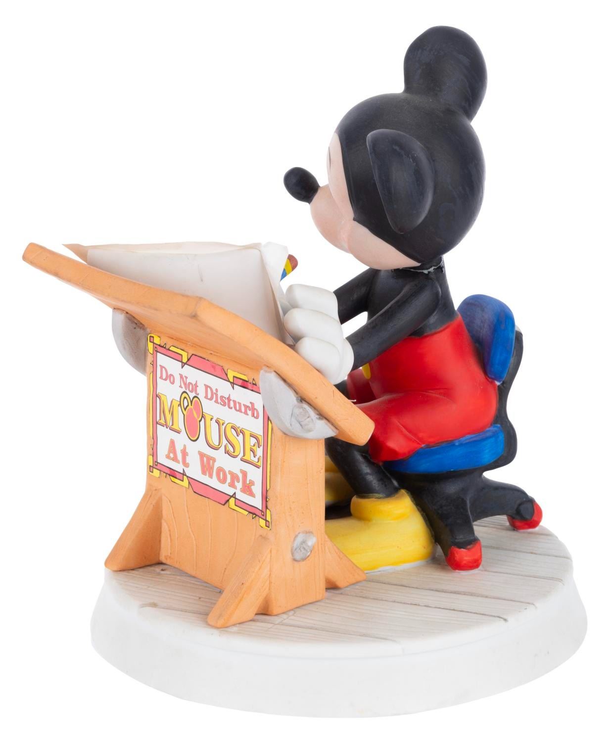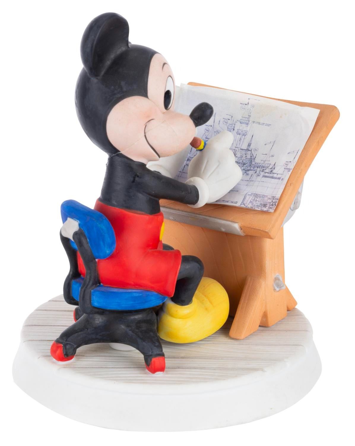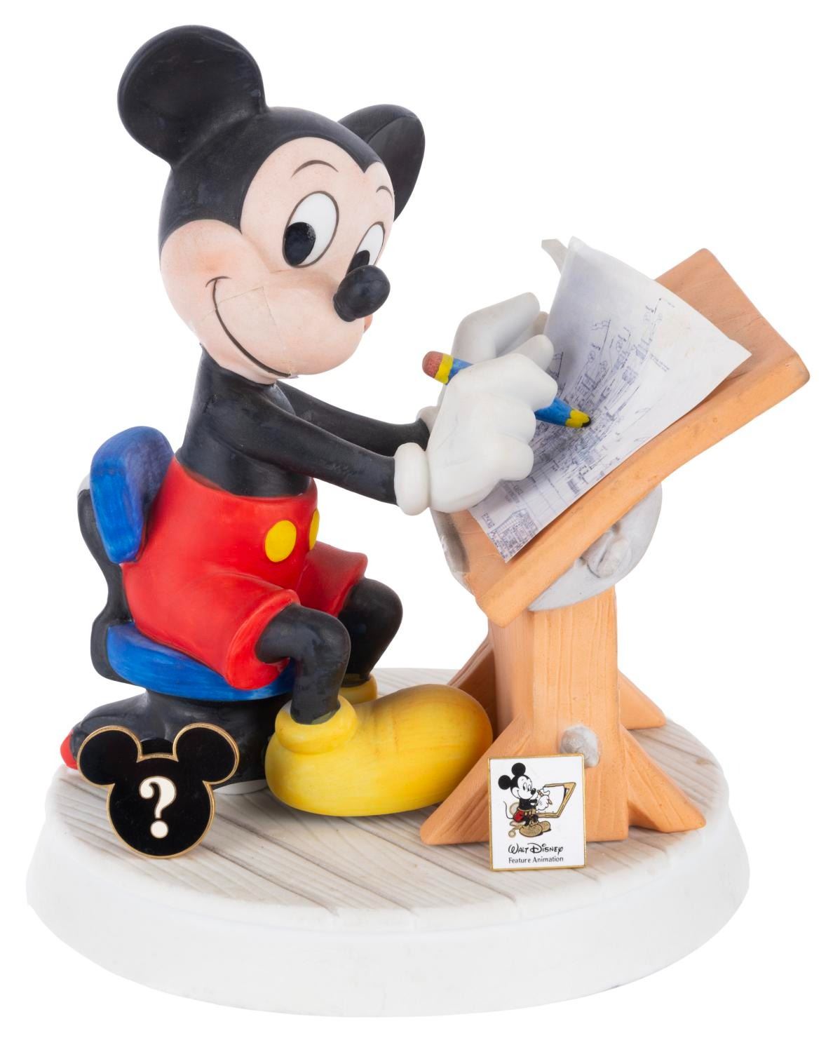 (Disney, 1990s-2000s) A Cast Member-modified Mickey Mouse sculpture and two pins. A castle blueprint has been adhered on Mickey’s easel with a “Do Not Disturb, Mouse At Work” sign added to the front. Included are a Walt Disney Feature Animation pin and a Mickey silhouette pin. Ranging in size from the 0.75” x 1” pin to the 6.75” tall and 6” in diameter porcelain sculpture, the items are in good condition with scuffs, scratches, stains, a small tear in the blueprint, and a large crack around Mickey’s neck and face from a previous repair.