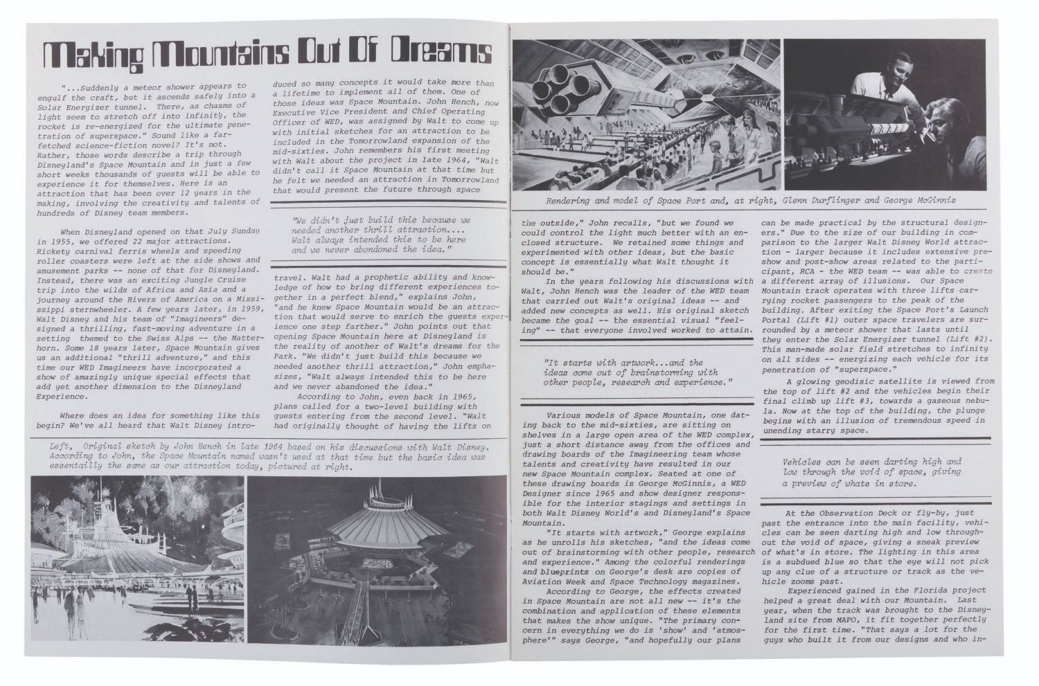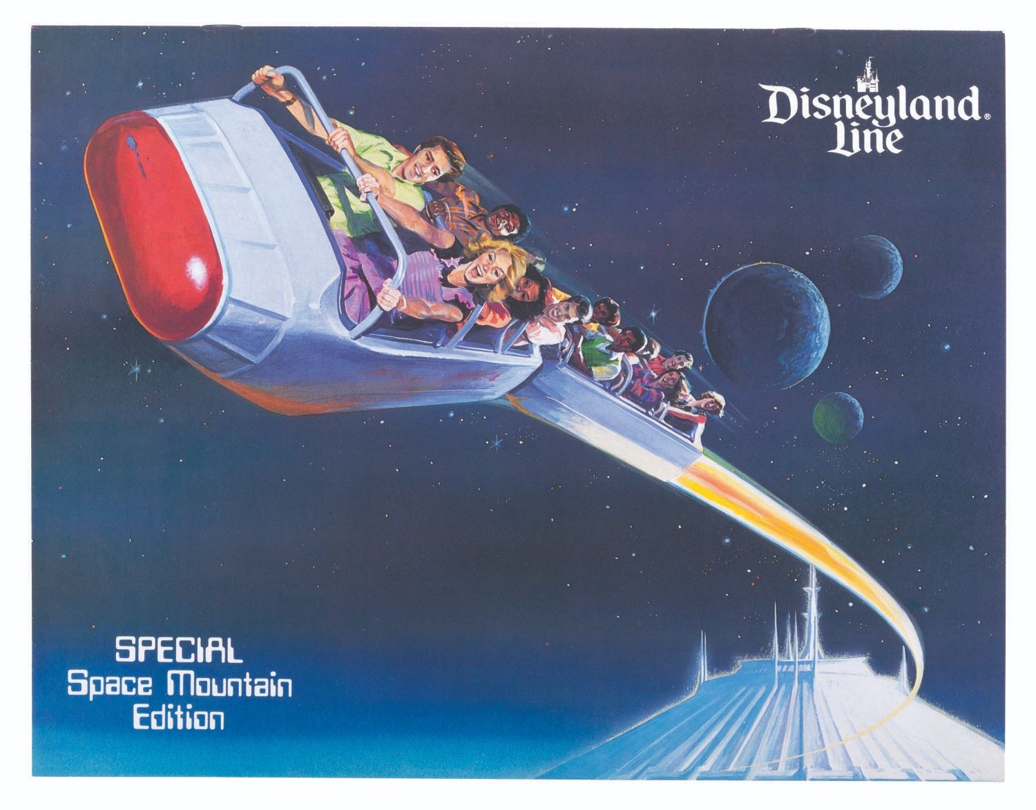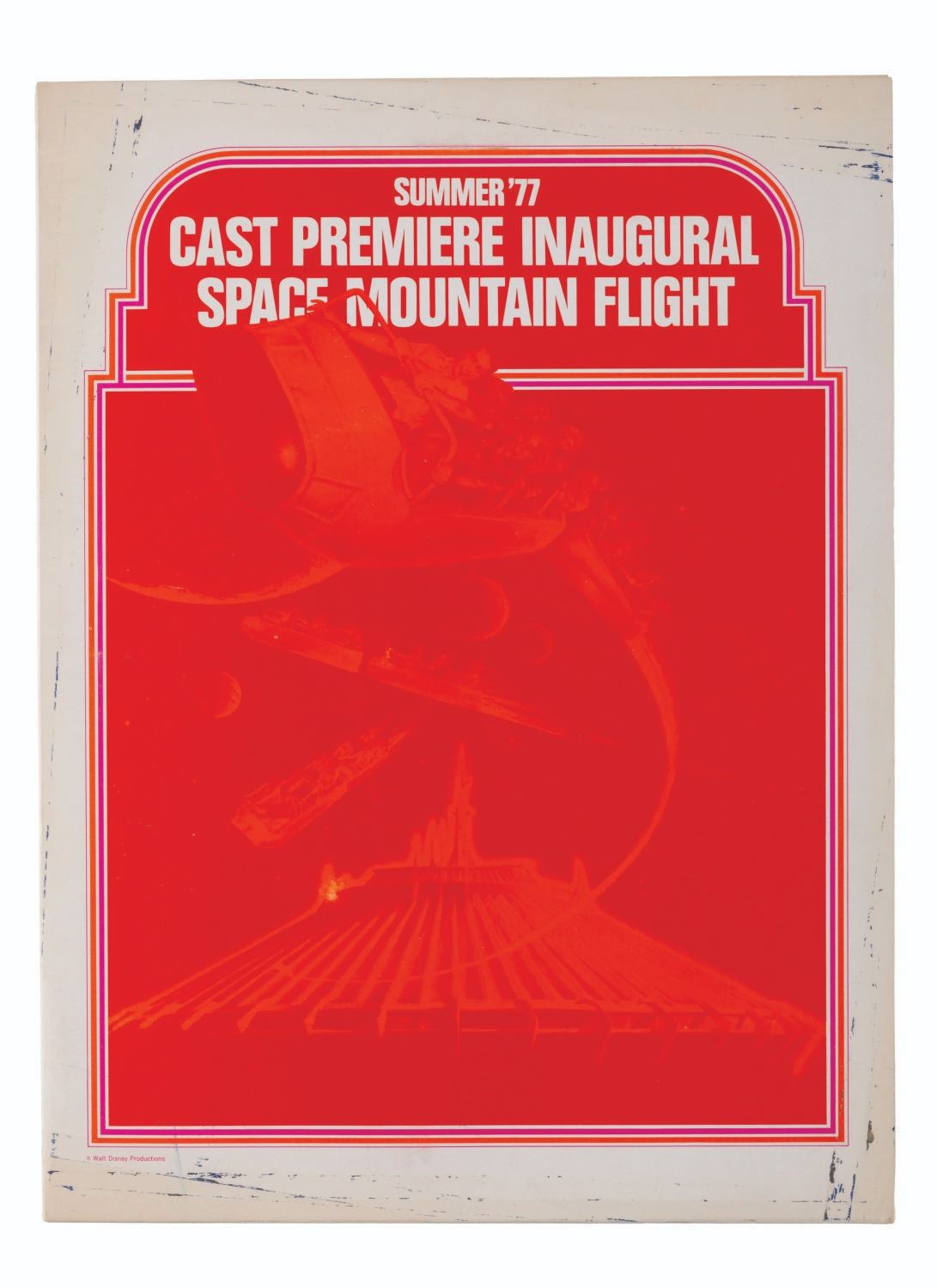 (Disneyland, 1977) A rare folder given to the Cast Members who attended the Inaugural Flight for Disneyland's Space Mountain in the Summer of 1977. Inside is a Special Space Mountain issue of Disneyland Line magazine that discusses the opening of the attraction with behind-the-scenes photos of concept art and Imagineering models. Measuring 9” x 12” overall, the folder is in good condition with dark scuffs around the edges. The Disneyland Line is in fine condition.
