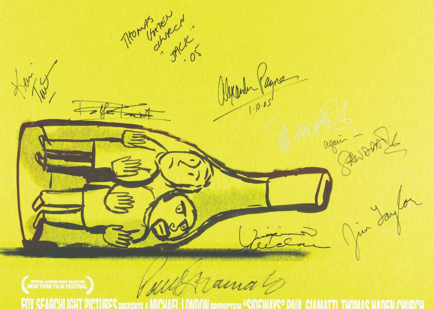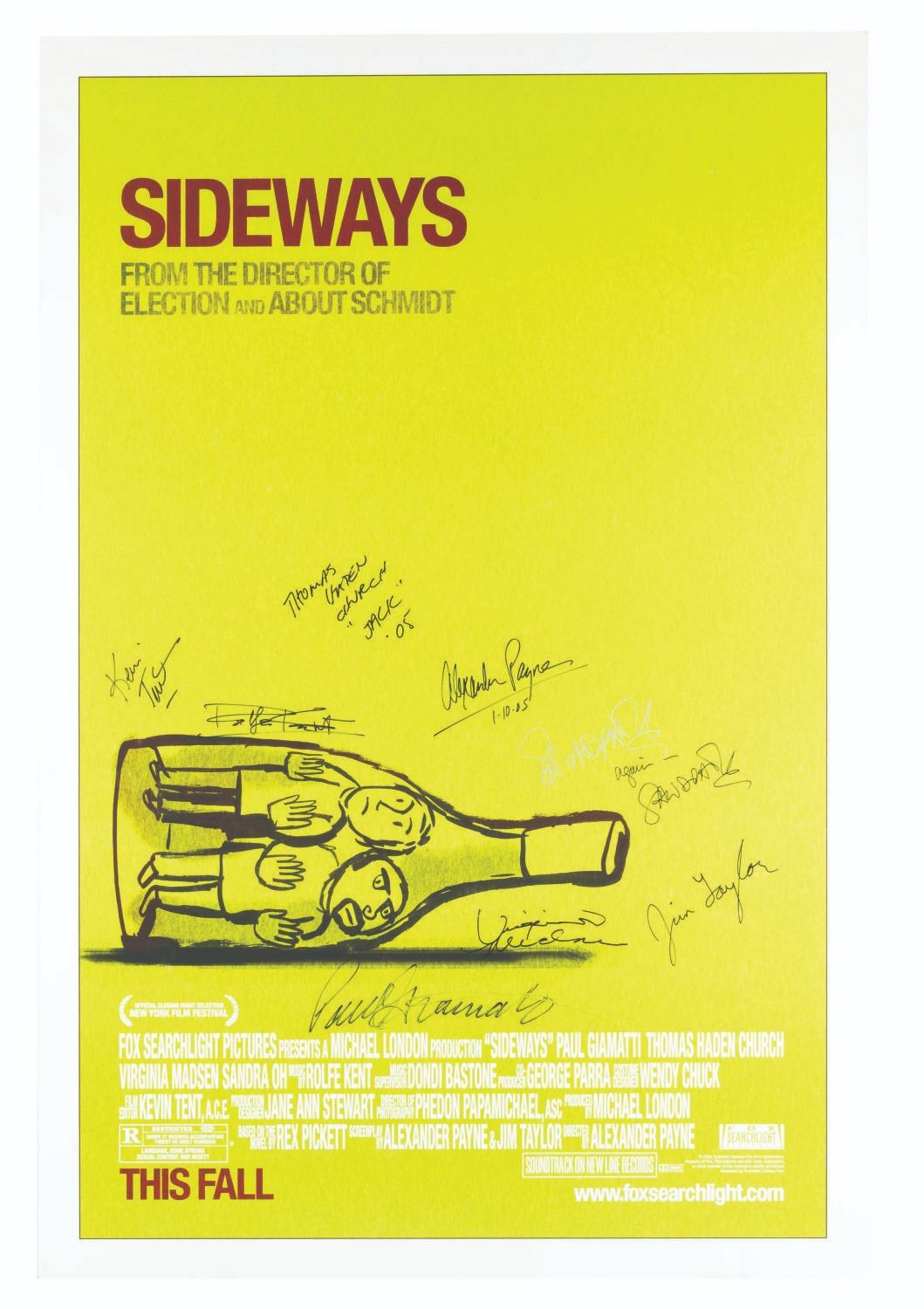 (Fox Searchlight, 2004) A one-sheet for the film "Sideways" signed at an award ceremony by eight members of the cast and crew. The autographs include Paul Giamatti, Thomas Hayden Church, Virginia Madsen, Sandra Oh (twice), Rolfe Kent (music by), Kevin Tent (film editor), and Screenwriters Alexander Payne & Jim Taylor. Measuring 26.5" x 39.5", the poster displays in very good condition, with light edge wear from handling including a 1" bent top left corner.