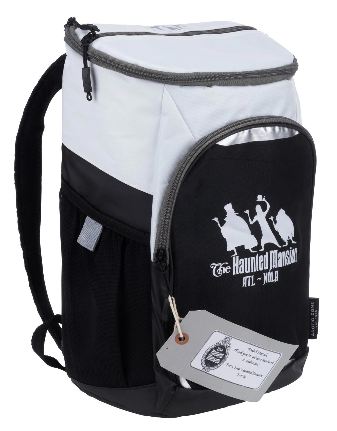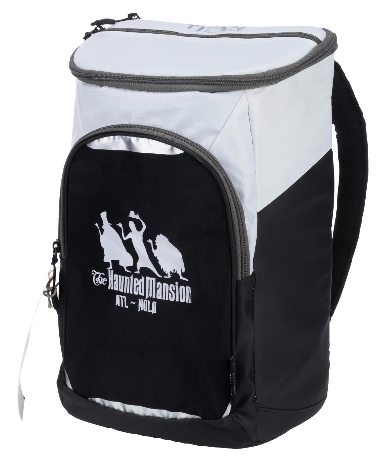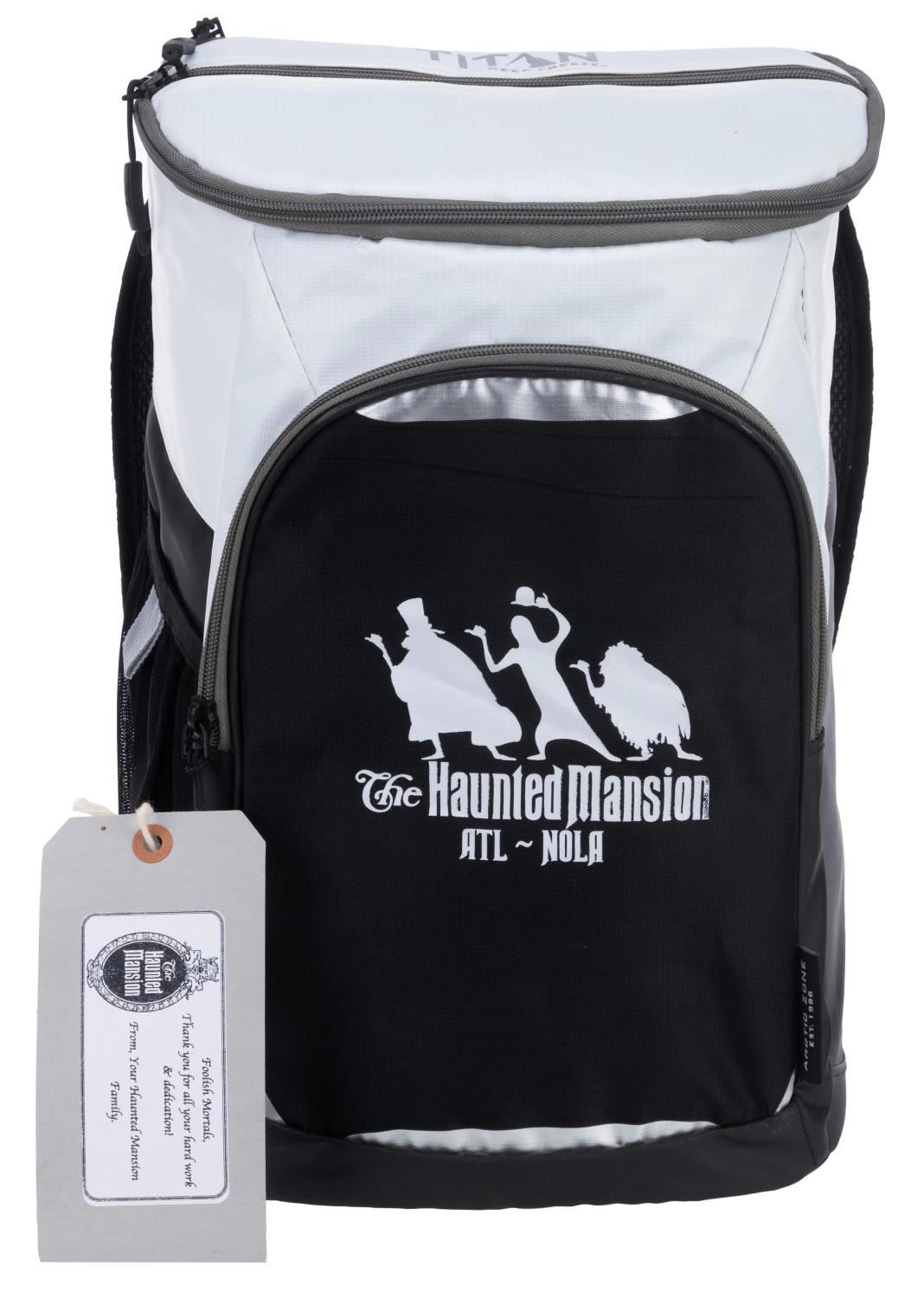 (Disney, 2023) An insulated backpack featuring the Hitchhiking Ghosts gifted to the New Orleans and Atlanta cast and crew of the film "The Haunted Mansion." Measuring 9.5" x 11" x 17" tall, the backpack is in very good condition with very light coiling from handling and age.