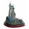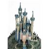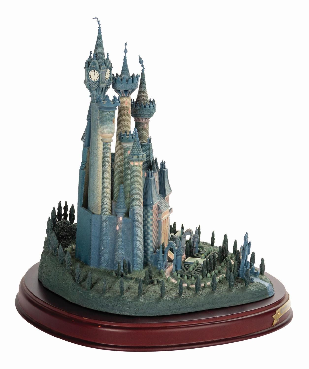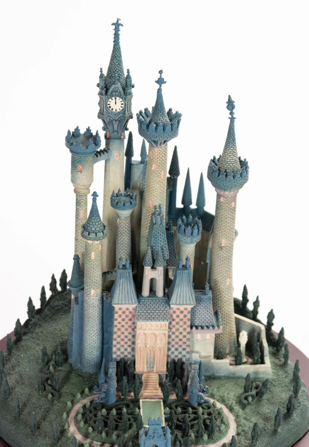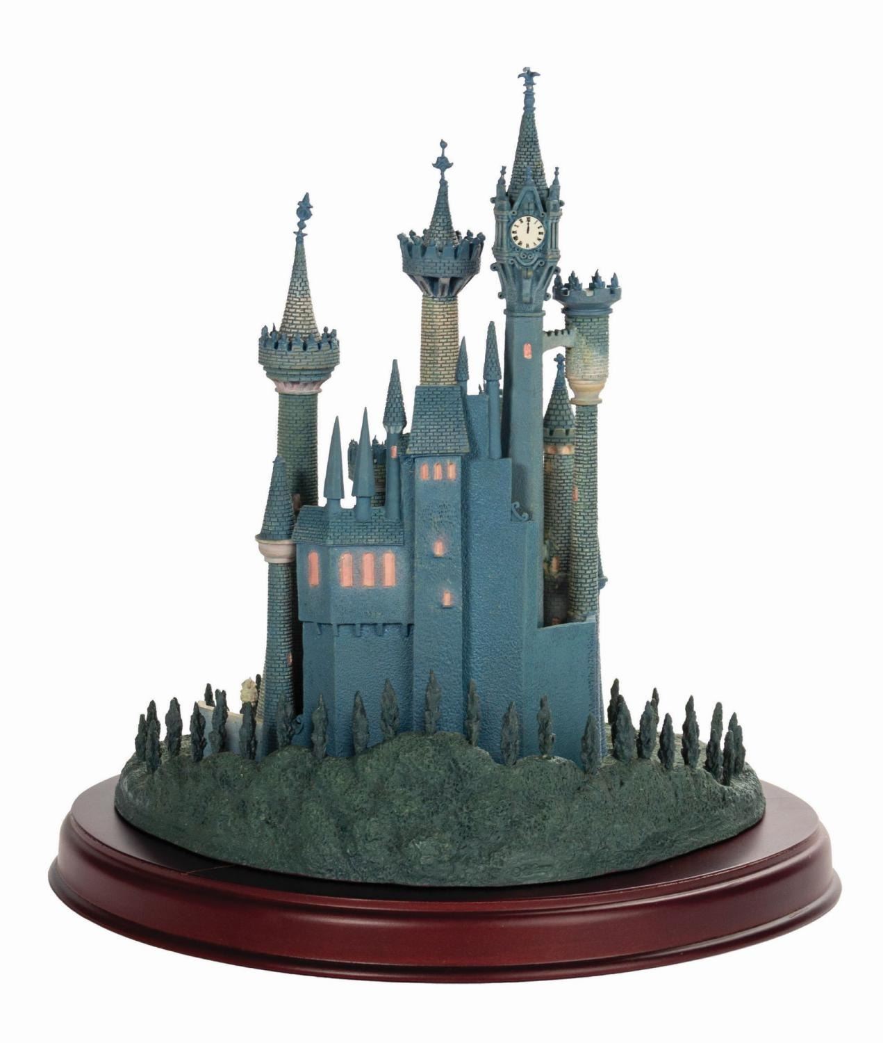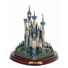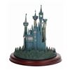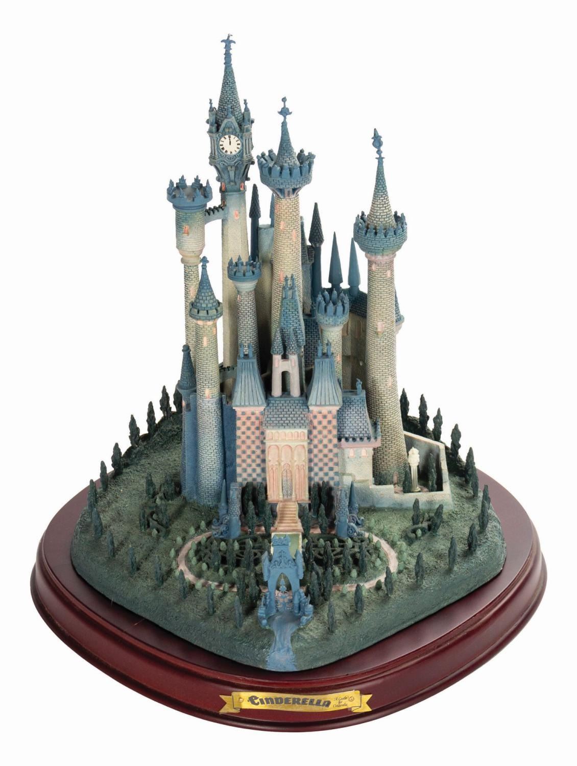 (Disney, 1996) A beautiful figure titled "A Castle for Cinderella" created for the Walt Disney Classics Collection. This porcelain figure captures the Castle in great detail, complete with landscaped grounds. Included is a wooden base with an engraved nameplate for display. Measuring 9.75"x9.75" and 10.25" tall with the base included, the castle is in good condition with a few spots of bending to metal details at the tips of the spires and at the front gate. There are two cracks on the base which cross the surface but are not deep.
