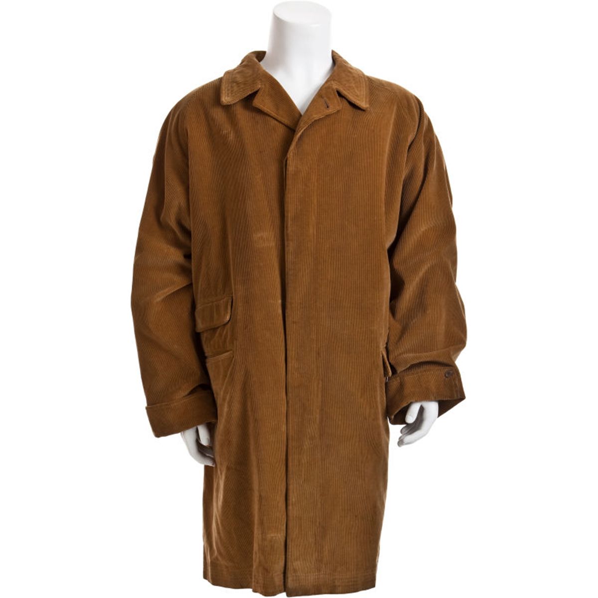 A Casual Overcoat, 1970s. Made of tan-colored corduroy, by Gucci of Roma, with three front pockets, a five button front closure, and button-cuff sleeves, inside lining red and black plaid wool, size 54; a Holiday Inn key from Casper, Wyoming still in a pocket. (Please note this jacket shows repair work and signs of heavy wear.)