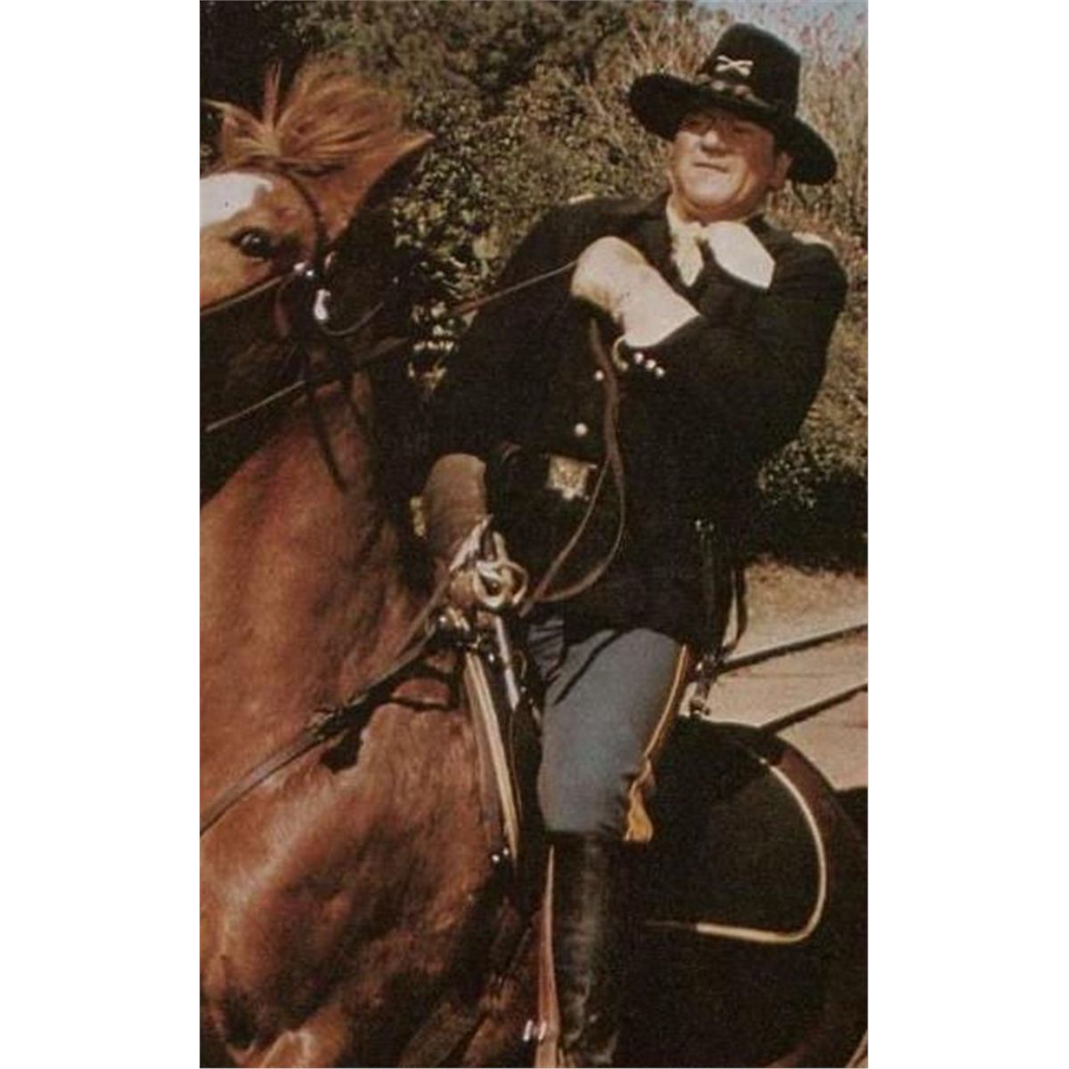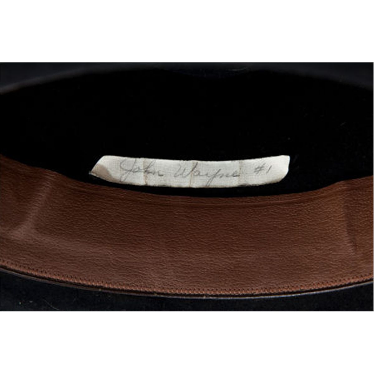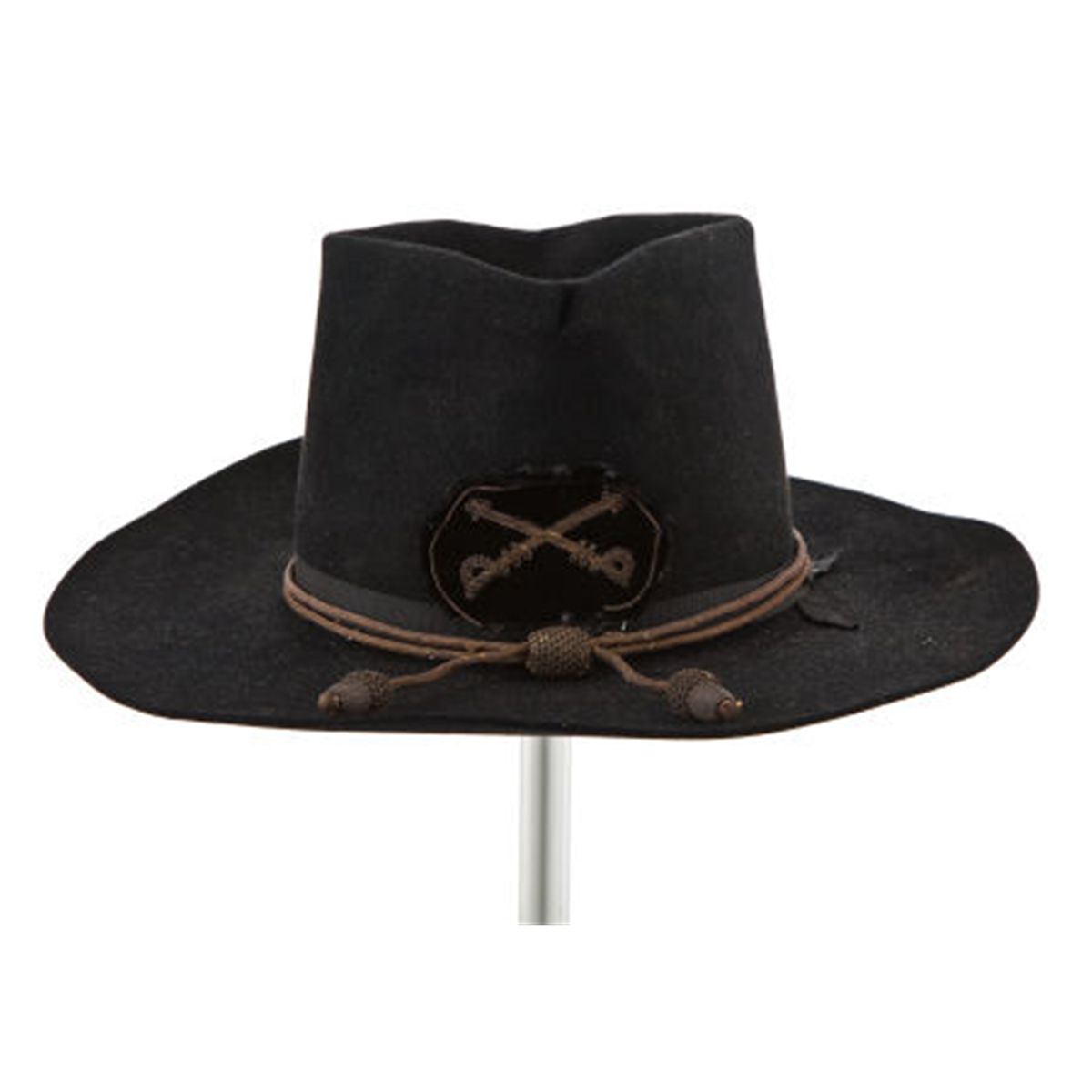A Cavalry Hat from "The Horse Soldiers," "Circus World," "The Undefeated," and Rio Lobo." United Artists, 1959; Paramount, 1964; 20th Century Fox, 1969; National General Pictures, 1970.  Made of black felt, brown cord 'acorn' hatband with further black ribbon detail, black velvet cavalry insignia on crown, inside has piece of tape with a handwritten annotation in pencil reading "John Wayne #1;" worn as Wayne portrayed "Colonel John Marlowe," "Matt Masters," "Colonel John Henry Thomas," and "Colonel Cord McNally" in the four different films.  (Please note this hat is dusty and shows signs of wear plus it has a hole at the top of the crown.)