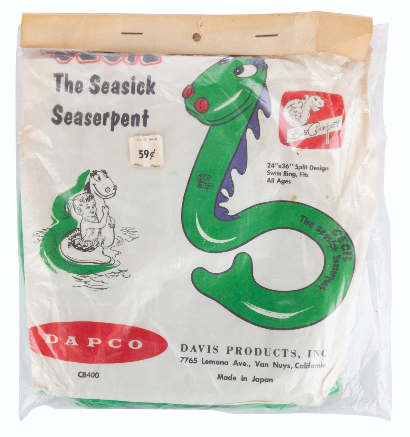 (Dapco, 1960s) A Cecil the Seasick Seaserpent Swim Ring by Dapco, sealed in the original packaging. The vinyl ring is labeled as measuring 24” x 36” and appears to be in fine condition, although inflatability cannot be confirmed. The 9” x 8.5” sealed bag is in fair condition with wear from handling and age.