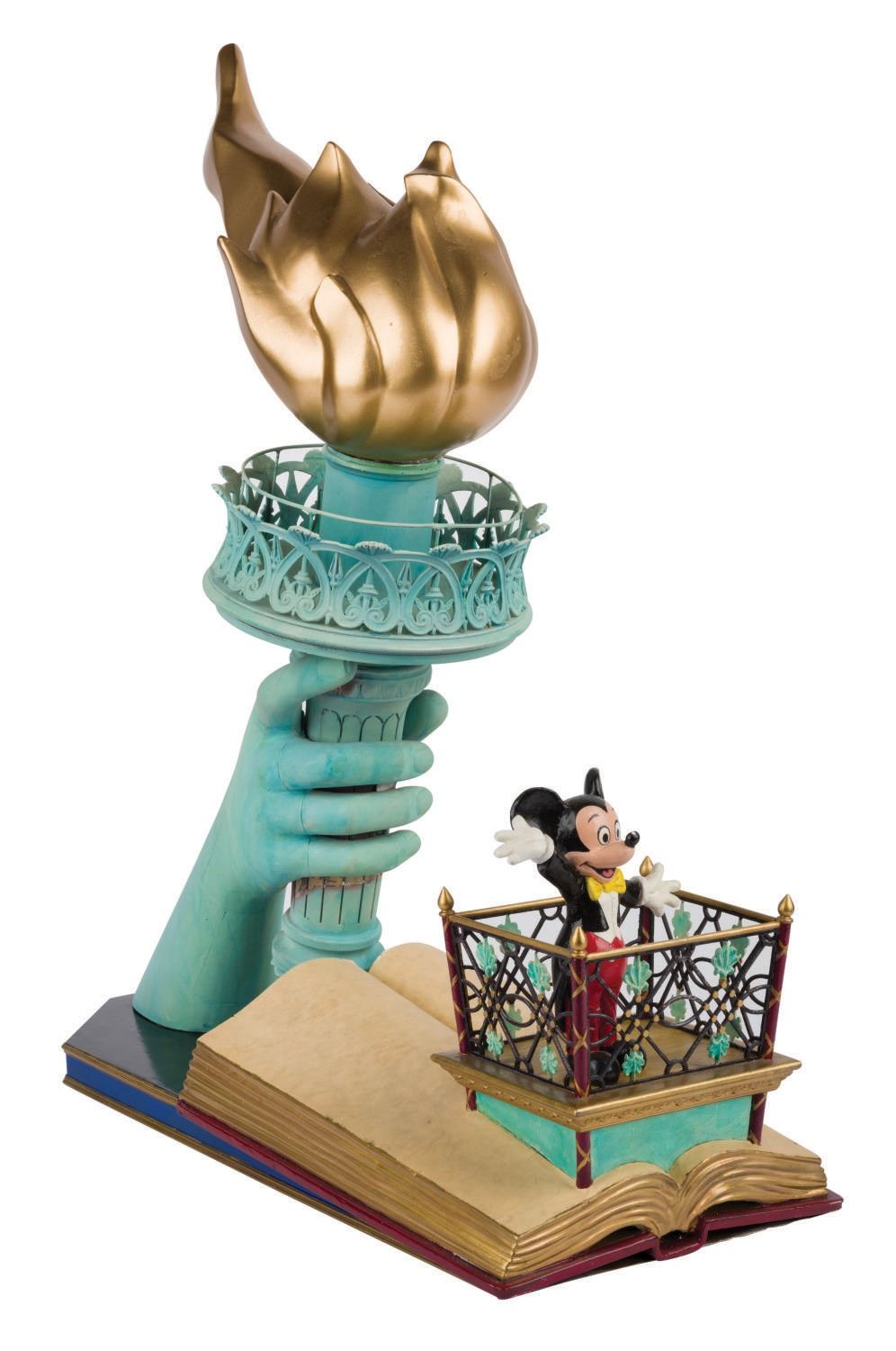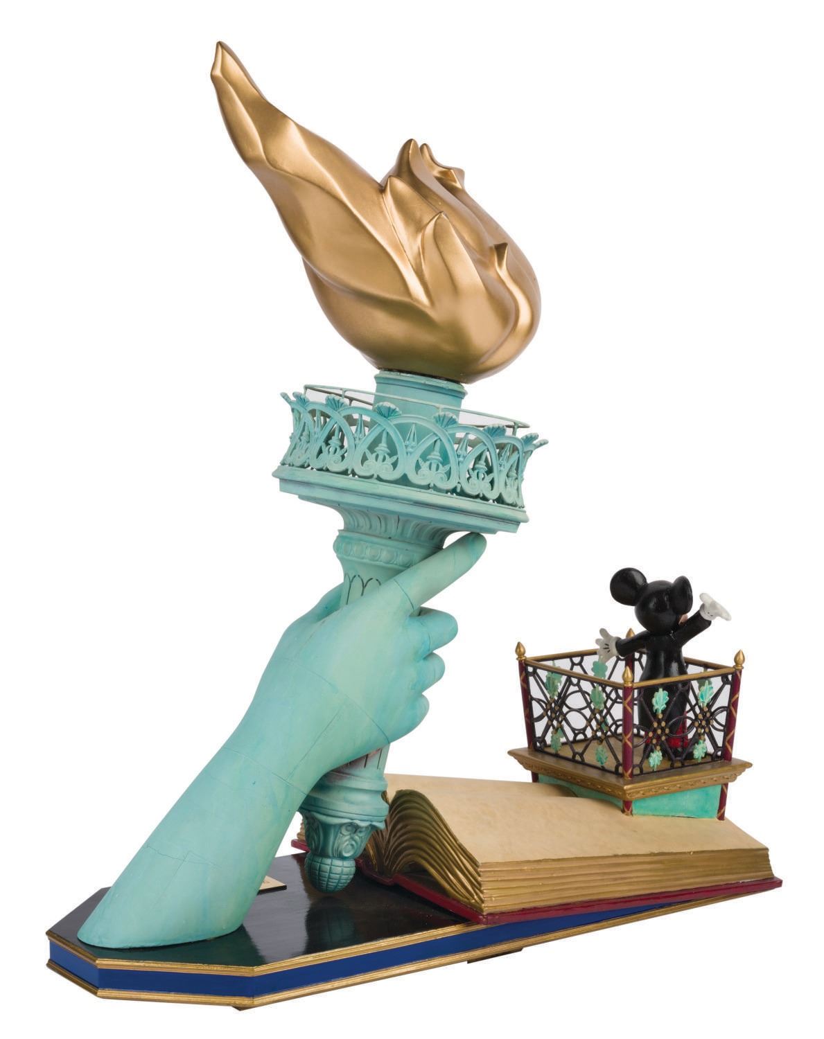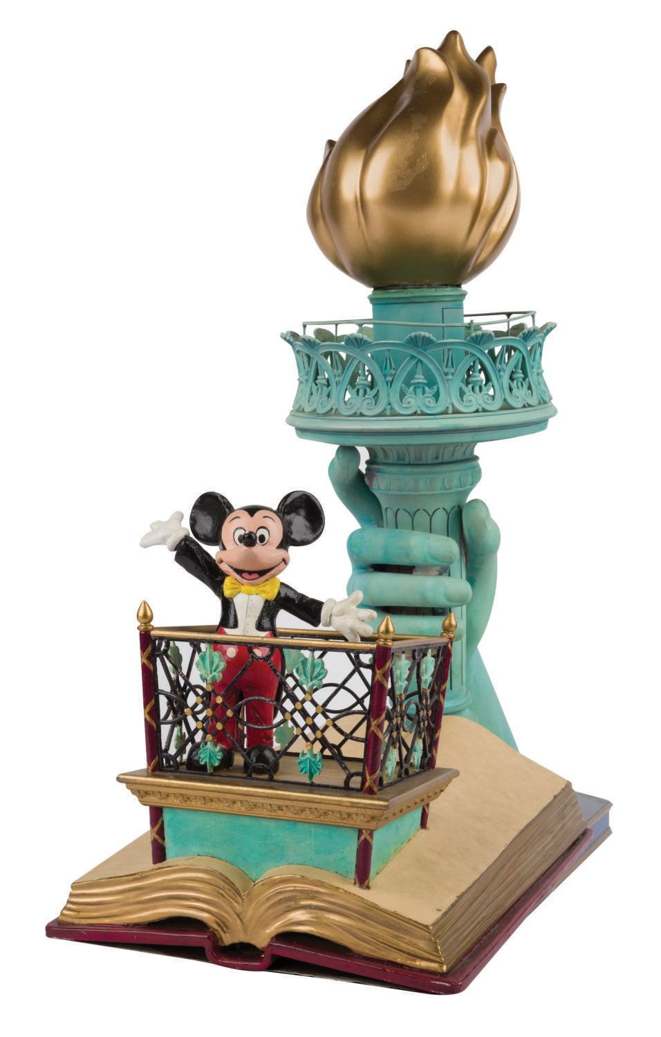(Disneyland, 1991) A stunning model for the final float in the Celebration U.S.A. parade at Disneyland. This parade debuted during the summer season of 1991 and celebrated America and life in the United States, culminating in this patriotic float carrying the familiar hand and torch of the Statue of Liberty. This beautiful hand-painted mock-up is hand-crafted from modeling clay, foam, and wood and bears a plaque on the base celebrating 50 Years of Magical Memories of the Park. Measuring approximately 23" tall and 9.25"x19.5", the maquette is in very good condition with imperfections original to production, cracks to Mickey's legs, surface wear, discoloration, and expected scuffs from age and use. This item will require special shipping arrangements. Please contact us for details and estimates.