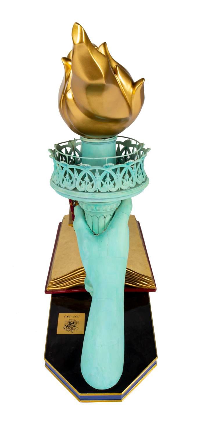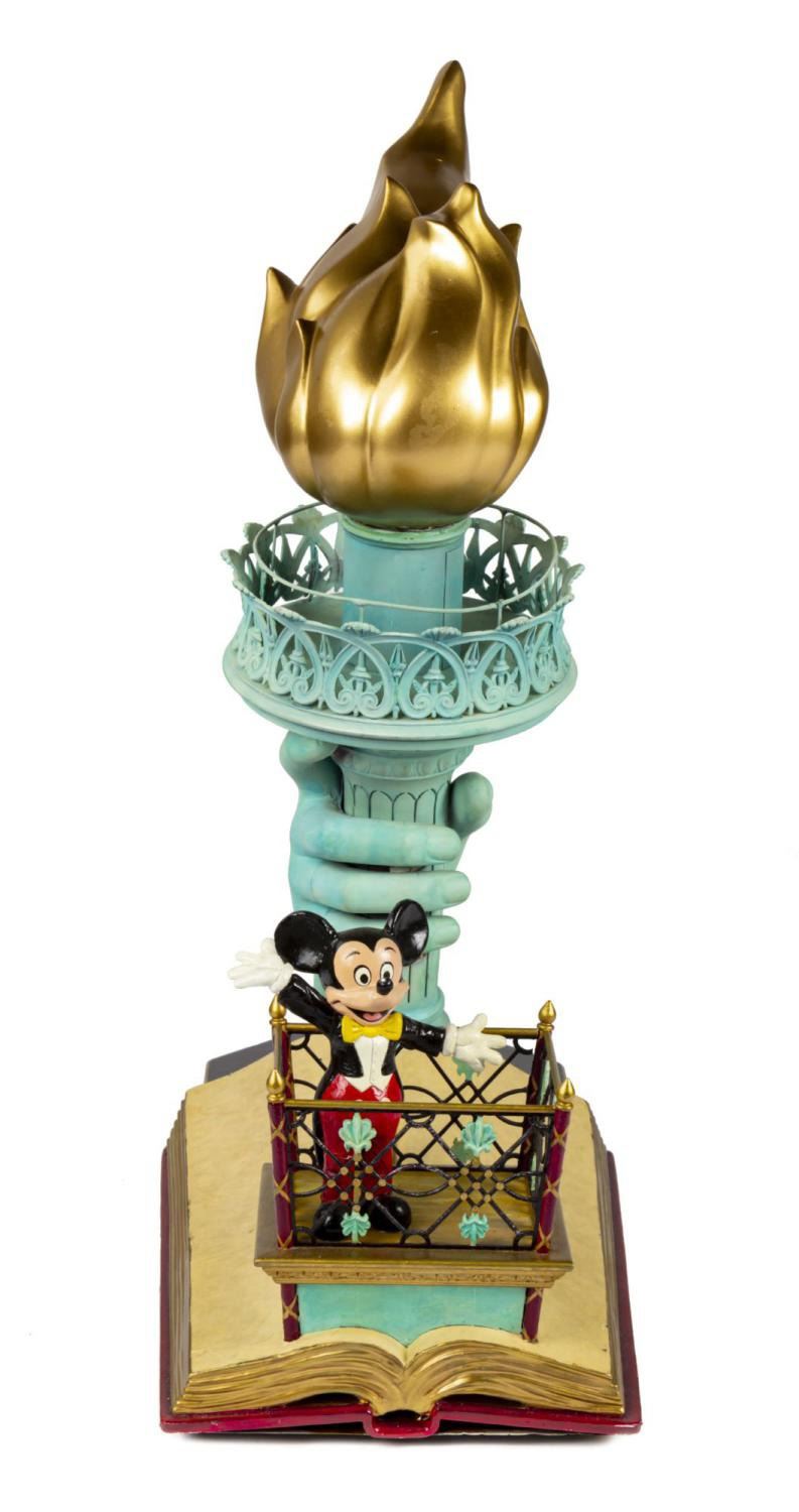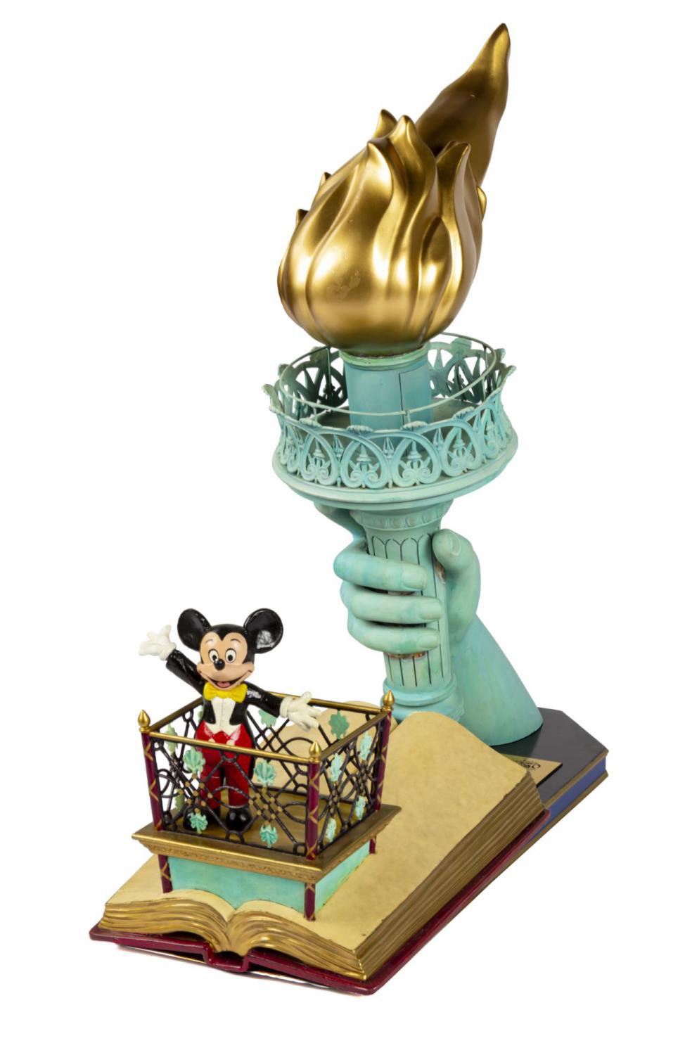 (Disneyland, 1991) A stunning model for the final float in the Celebration U.S.A. parade at Disneyland. This parade debuted during the summer season of 1991 and celebrated America and life in the United States, culminating in this patriotic float carrying the familiar hand and torch of the Statue of Liberty. This beautiful hand-painted mock-up is hand-crafted from modeling clay, foam, and wood and bears a plaque on the base celebrating 50 Years of Magical Memories of the Park. Measuring approximately 23" tall and 9.25"x19.5", the maquette is in very good condition with imperfections original to production, cracks to Mickey's legs, surface wear, discoloration, and expected scuffs from age and use. This item will require special shipping arrangements. Please contact us for details and estimates.