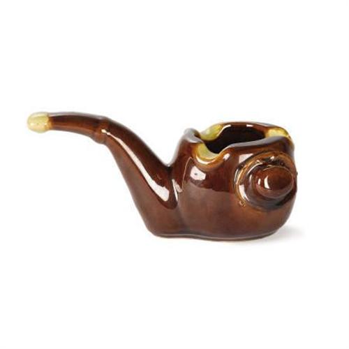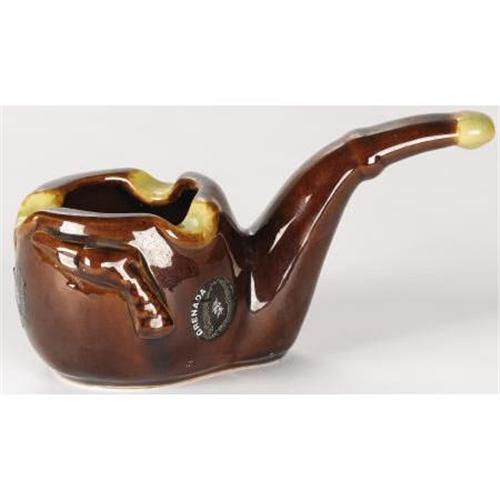 <B>A Ceramic Pipe Ashtray<BR></B></I>Unknown maker, Taiwan<BR>Twentieth Century<BR>With a brown glaze and yellow details, raised image of a hat on one side of the bowl and a gun on the other<BR>Labeled <I>Grenada</B></I> to one side of the bowl<BR>3.5 inches high x 4 inches wide<BR><BR><b>Shipping:</b> Requires 3rd Party Shipping (<a target="_blank" href="http://www.heritageauctions.com/common/shipping.php">view shipping information</a>)