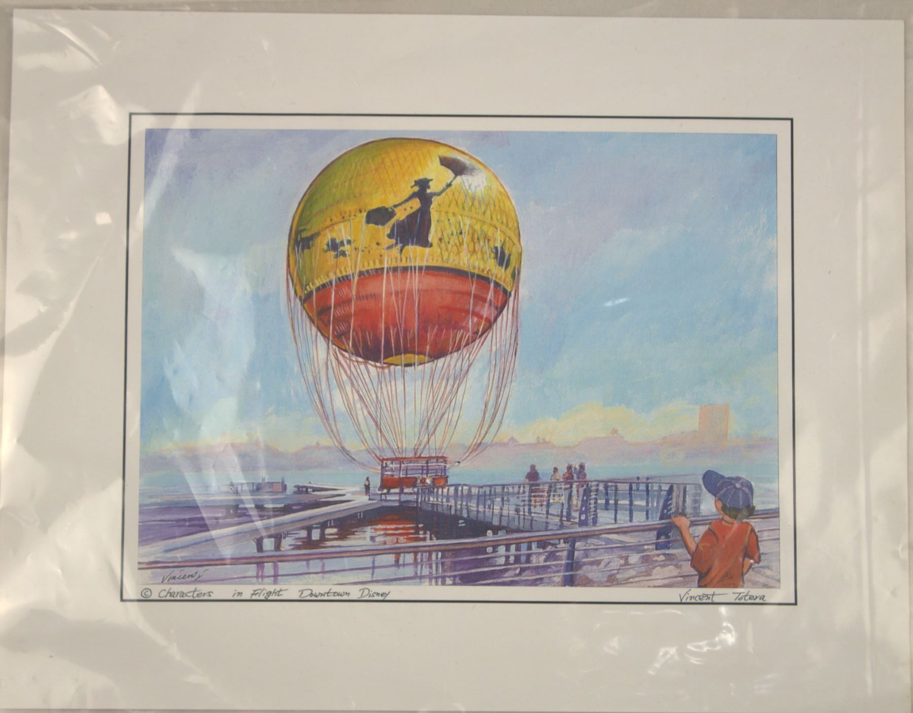 This watercolor reproduction measures 11" x 8.5" and is printed on paper stock. The image is of the Characters in Flight hot air balloon about to receive passengers and a boy looking on from the end of the loading pier. Vincent T is located in the bottom left of the print. Below the print on the left is Copyright Characters in Flight Downtown Disney and on the right is Vincent Totera written in pen.