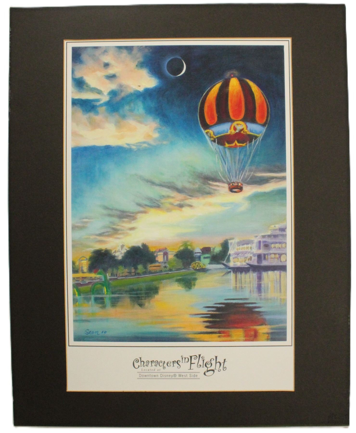 This matted print Is titled Characters in Flight. It also states "Located at Downtown Disney West Side." The signature Seon Lo is located at the bottom left of the art print. It appears to have been used to advertise the Characters in Flight hot air balloon ride located at the now Disney Springs at the Walt Disney Resort. The print is in excellent condition and measures 16" x 20". No COA