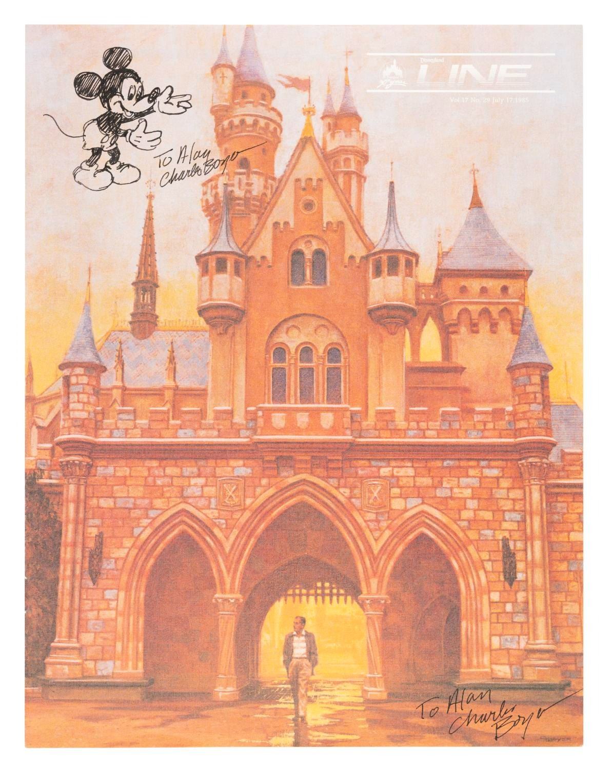 (Disneyland, 1985) A Vol. 17 No. 29 Disneyland Line from July 17, 1985, signed twice by artist Charles Boyer to super-collector Alan Hylton. Boyer also drew a Mickey Mouse in black ink at the top left corner of the cover. Measuring 8.5” x 11”, the issue is in fine condition.