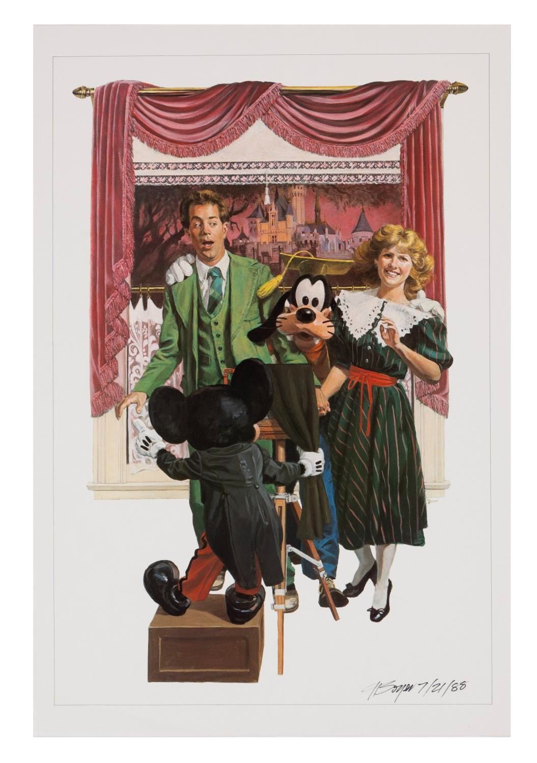 (Disneyland, 1988) A signed Charles Boyer Disneyland print titled "A Nite to Remember." The original painting, created by Boyer for the 1983 graduating classes, features a young couple celebrating their high school graduation as Mickey takes their photo with Goofy popping into the frame. Measuring 14.75" x 22", the poster displays in very good condition, with light wear and a soft horizontal crease at the bottom left corner and another on the right side.