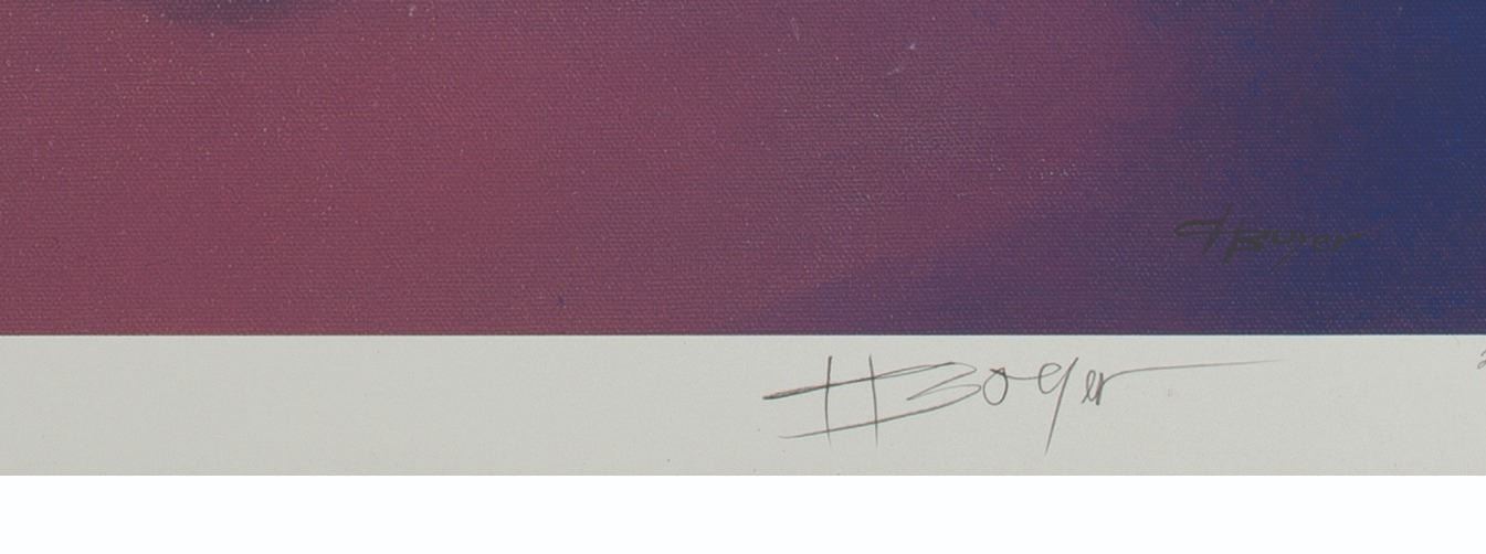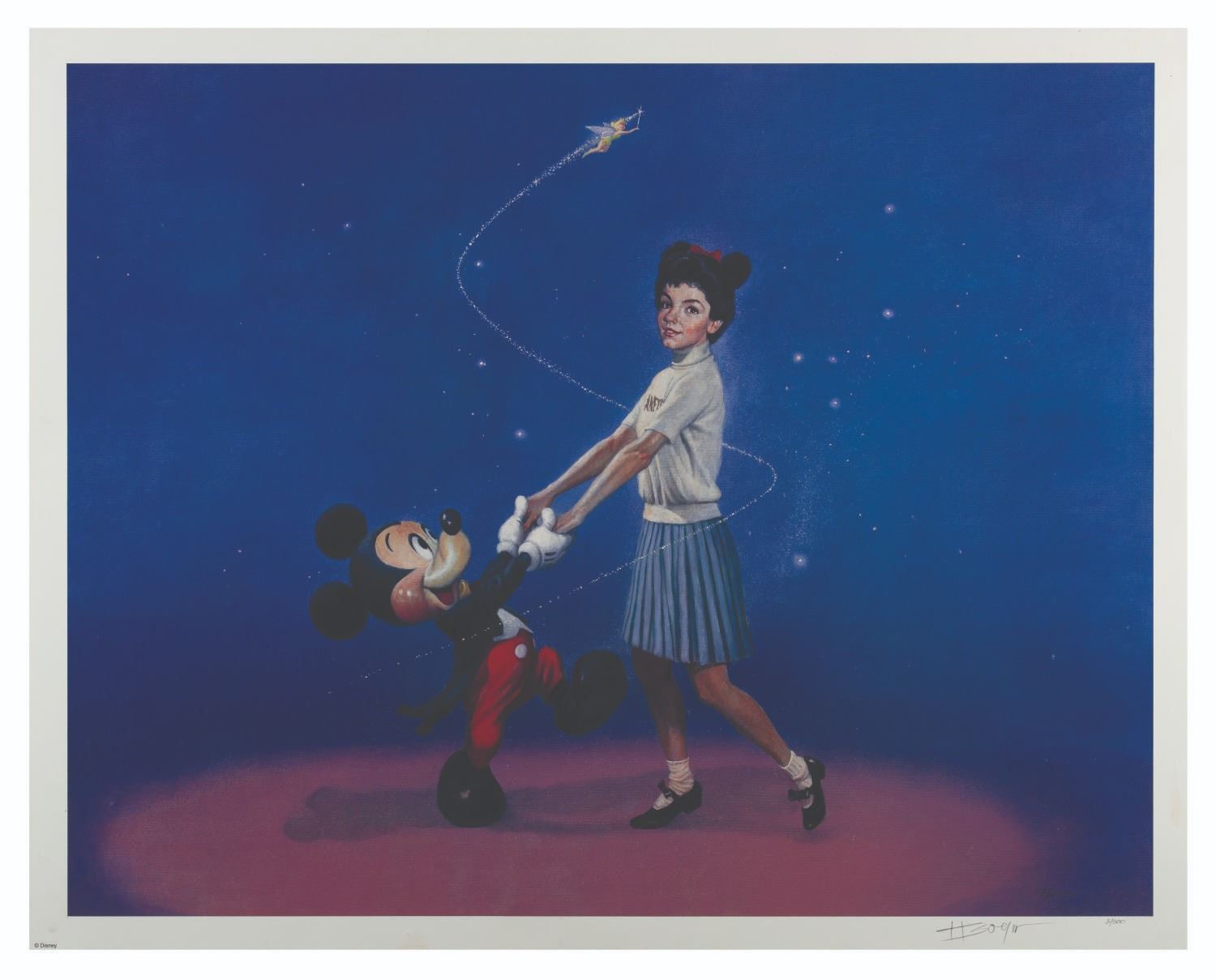(Disneyland, 1998) A limited edition lithograph of Annette Funicello and Mickey Mouse titled “Sweethearts Forever.” The print has been signed by the artist Charles Boyer in graphite at the lower right corner and is hand-numbered 2 of 300. With an image size of 22” x 28” and measuring 24” x 30” overall, the print displays in very good condition with raised bumps throughout, light wear, and discoloration in the border, which does not affect the image.