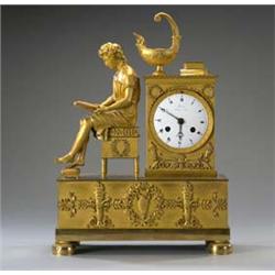 A Charles X Ormolu Mantel Clock, by Hesnil, Paris], of Empire style, with signed enamel dial, in rectangular case applied with wreaths and typical stylised flowers with seated youth reading a book, upon a similarly decorated rectangular base, the case by Ravrio 'Bronzier a Paris', {39cm} £900-1400