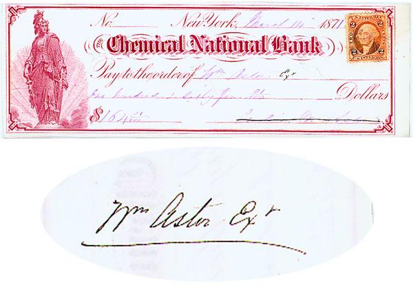 CAROLINE and WILLIAM ASTOR. ADS. 1pp. 8" x 2 3/4". New York. March 14 1871. A check signed "Caroline W. Astor" and completely engrossed by her. The "Chemical Bank" check paid "Mr. Wm. Astor One hundred & sixty four Dollars and one cent". It is endorsed on the verso "Wm Astor". There is a cut cancellation that does not affect either signature and a thin ink line through Caroline's signature, but her autograph is still fully readable.