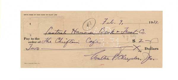 WALTER P. CHRYSLER. ADS. 1pp. 6 3/4" x 2 3/4". New York. Feb 9, 1931. A "Central Hanover Bank and Trust Company" check signed "Walter P Chrysler Jr.". He paid "The Chieftain Cafe $2.-". The check has the usual punch cancellations that barely affect the engrossment but not the signature. It is in very fine condition with a dark signature.