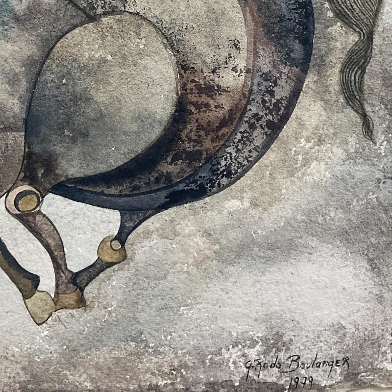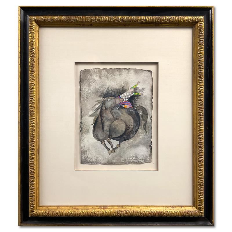 "A Cheval" is an original watercolor painting on paper by Graciela Rodo Boulanger, dated 1979 and hand signed by the artist. This piece comes framed. Includes Letter of Authenticity. Measures approx. 28.5" x 25" (frame), 12" x 9" (image). There is very minor wear on the frame.