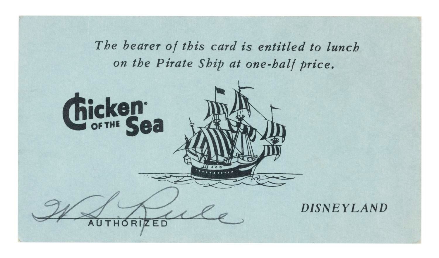 (Disneyland, 1950s-70s) A coupon offering a Guest a half-price lunch at Disneyland's Chicken of the Sea Restaurant in Fantasyland. Measuring 2.25” x 4”, the coupon is in very good condition with light discoloration from age, edge wear, and inscribed with the signature of “W.S. Rule.”
