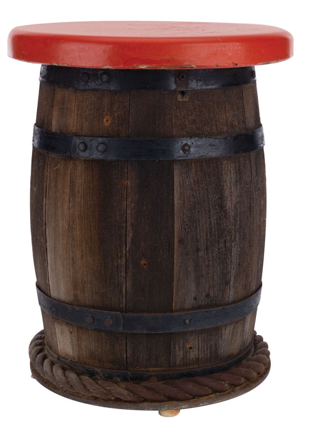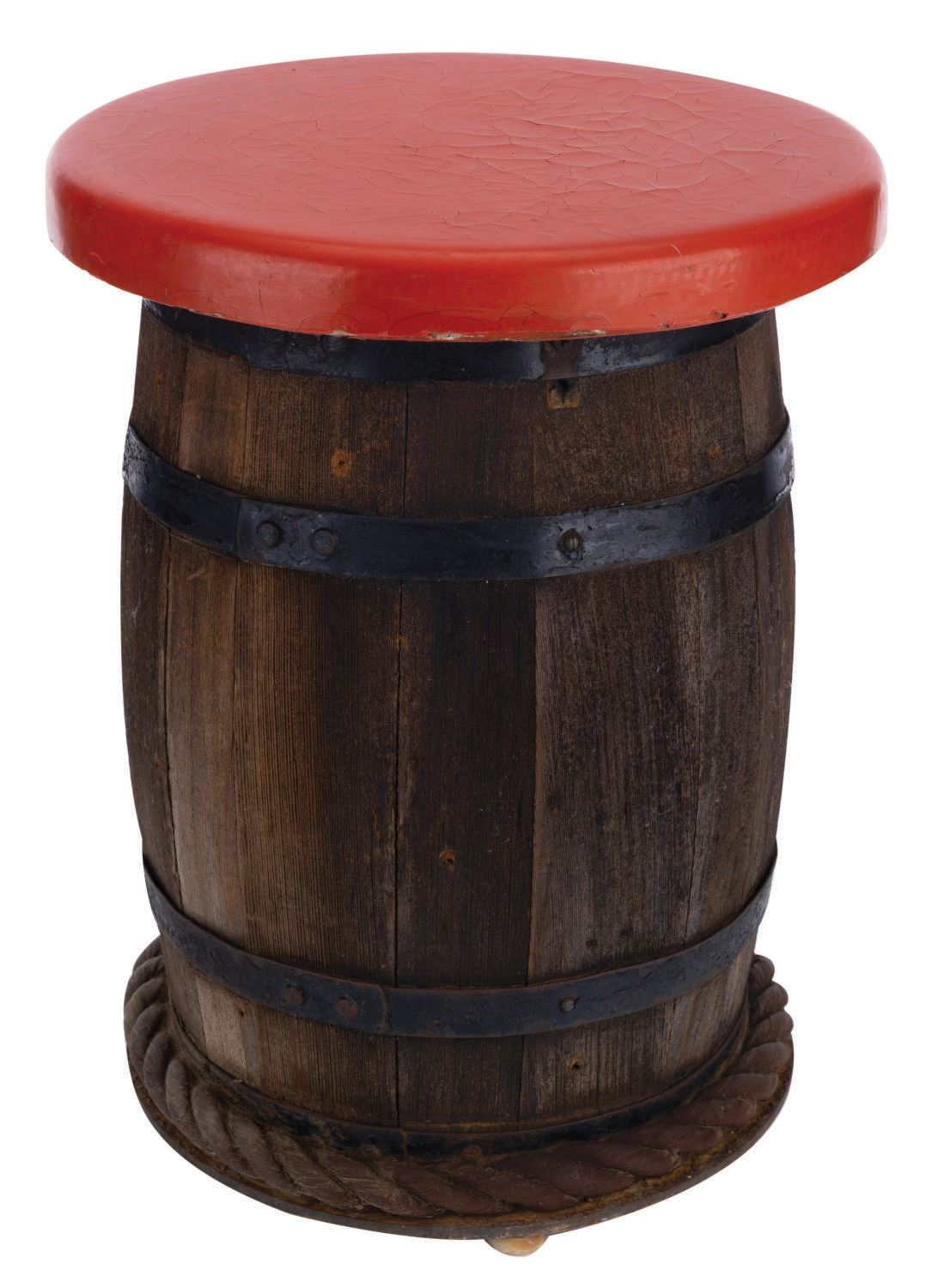 (Disneyland, 1960-1982) A rare original barrel style seat from the Chicken of the Sea Pirate Ship and Captain Hook's Galley Restaurant. The Chicken of the Sea Pirate Ship restaurant opened in 1955. Five years later the outdoor seating area was efficiently expanded, and the surrounding area's show quality was enhanced to include Herb Ryman's designs for Skull Rock Cove. The dining area was decorated with oars, sails, lanterns, and powder kegs, while the tables and chairs were patterned after barrels, crates, and pirate's booty. This stool may have been removed during a rehabilitation of the restaurant or upon its closure as Captain Hook's Galley in 1982. Measuring 19" tall and 14" in diameter the piece is in very good condition with cracks to the seat surface, and expected scuffs, scratches, and wear from exposure, handling, and age.