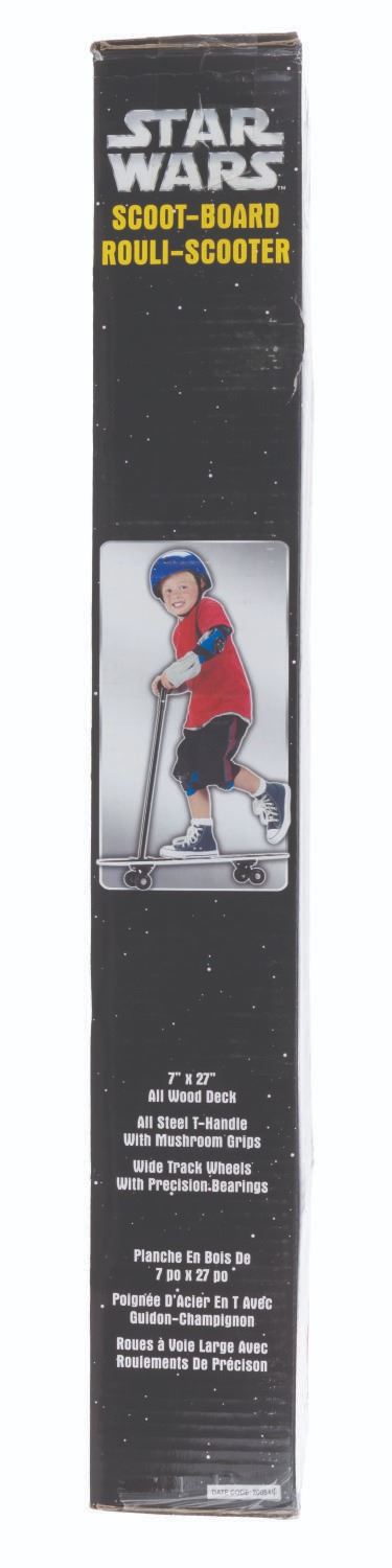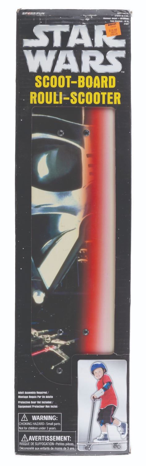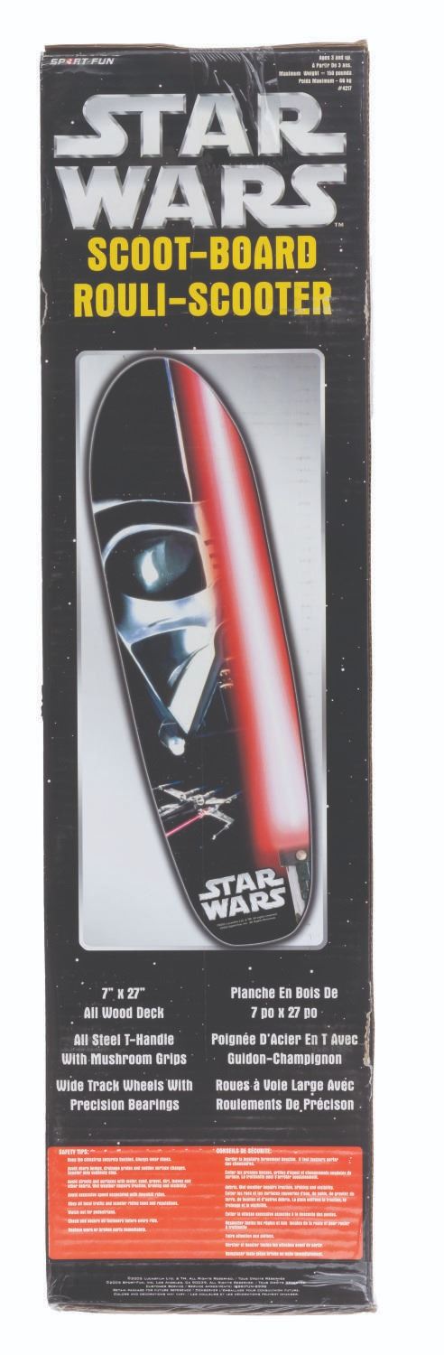 (Sport-Fun, 2005) A children’s “Star Wars” Scoot-Board Rouli-Scooter featuring Darth Vader. The unused wood deck scooter measures 7” x 27” with a steel T-handle and is sealed in the original box measuring 7” x 27.5” x 3.75”. The box displays in good condition with wear and tear and creases.