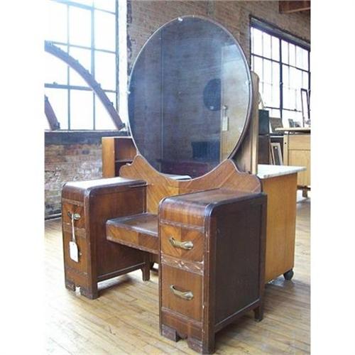 Child's miniature art deco vanity from the 1930s in walnut veneer. This piece has the original brass handles. Mirror should be resilvered. Veneer in nice shape although there are a couple chips as shown and some minor surface scratches. Please e-mail us for additional pictures.