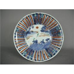 A Chinese 18th century bowl decorated with figures and mules and later green and red enamels, cha...