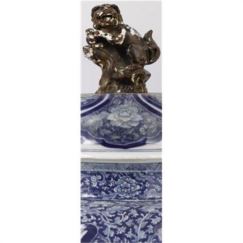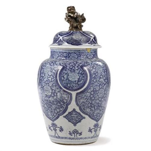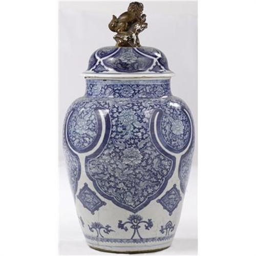 <B>A Chinese Blue and White Urn<BR></B></I>Maker unknown<BR>Circa 1900<BR>Decorated with a gilt dog on top<BR>Unmarked<BR>27.5 inches high<BR><BR><b>Shipping:</b> Requires 3rd Party Shipping (<a target="_blank" href="http://www.heritageauctions.com/common/shipping.php">view shipping information</a>)