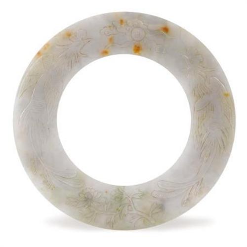 <B>A Chinese Carved Jade Bi<BR></B></I>Nineteenth/Twentieth Century<BR>6-1/4 x 6-1/4 inches (15.9 x 15.9 cm)<BR> <BR>The Chinese carved grey jade bi with russet inclusions, incised with designs of phoenix birds.<BR><BR><b>Shipping:</b> Requires 3rd Party Shipping (<a target="_blank" href="http://www.heritageauctions.com/common/shipping.php">view shipping information</a>)