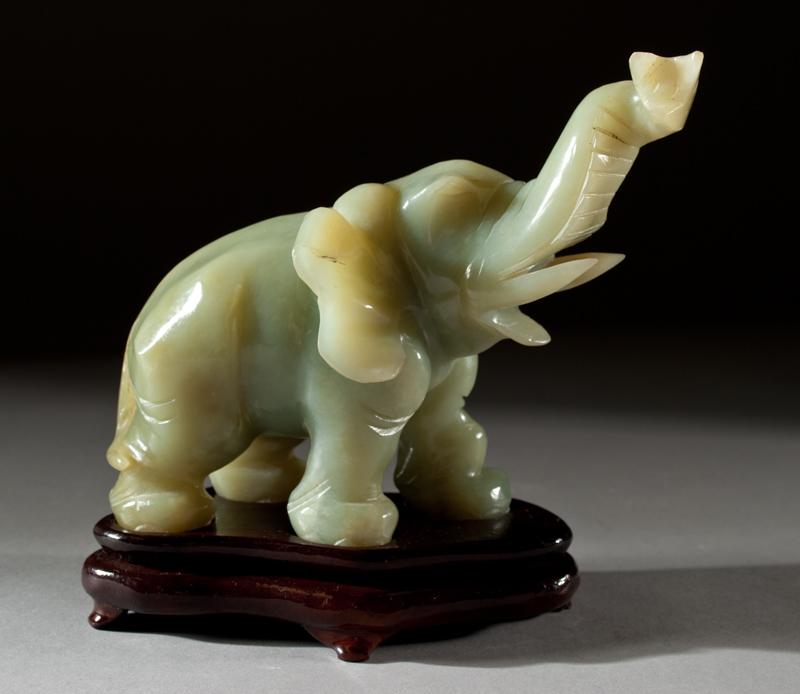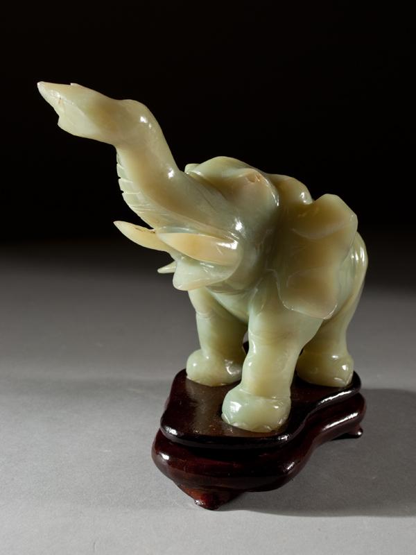 Finely carved to depict an elephant with tusk in upright position with matching hardwood stand. 7.5" L x 5.5" H, not including stand. Circa 20th century. Appraised in 1988 by Chicago Appraisers Association for $1200, appraisal on file.