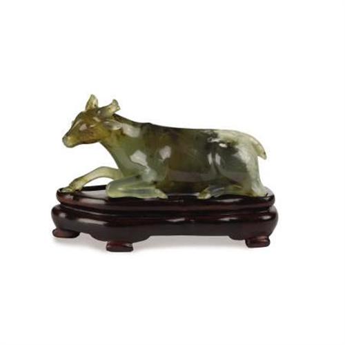 <B>A Chinese Carved Jade/Hardstone Recumbent Stag<BR></B></I>Twentieth Century<BR>2 x 4 inches (5.1 x 10.2 cm)<BR> <BR>Of light green coloration with brown and white inclusions, the Chinese mythical stag, symbolic of longevity and income, is said to turn white after 500 years. This characteristic is exploited by the carver's clever usage of the white inclusion on the hindquarters of the stag. Its celestial and spiritual qualities are reflected in the shallow incised star motif across the body.<BR><BR><b>Shipping:</b> Requires 3rd Party Shipping (<a target="_blank" href="http://www.heritageauctions.com/common/shipping.php">view shipping information</a>)
