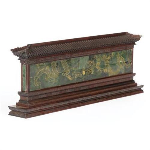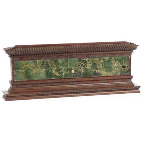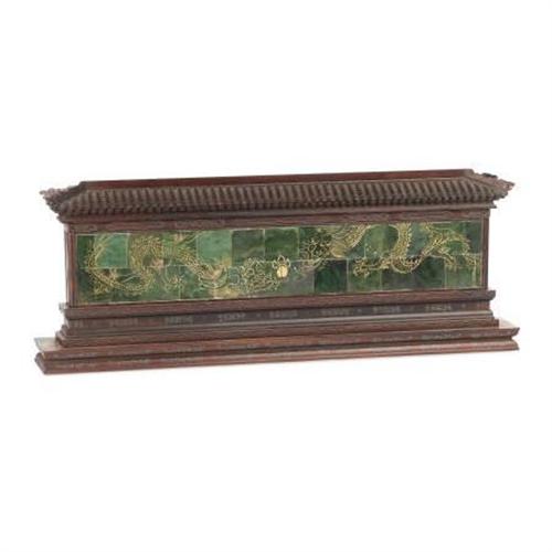 <B>A Chinese Carved Jade Tablet<BR></B></I>Nineteenth/Twentieth Century<BR>7 x 18-1/2 inches (17.8 x 47.0 cm)<BR> <BR>The Chinese carved spinach green jade tablet composed of 24 small square blocks of jade set into a frame and decorated in gilt with two dragons in pursuit of a flaming pearl on each side. All set into a frame resembling a roof, the lower portion of wood frame decorated with nine dragon designs in inlaid silver wire.<BR><BR><b>Shipping:</b> Requires 3rd Party Shipping (<a target="_blank" href="http://www.heritageauctions.com/common/shipping.php">view shipping information</a>)