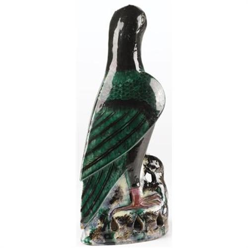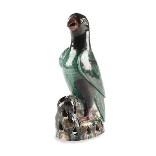 <B>A Chinese Ch'ing Dynasty Ceramic Parrot<BR></B></I>Unknown maker<BR>Possibly Kangxi Period, c.1722<BR>In a green and aubergine glaze<BR>Unmarked<BR>10.7 inches high x 3 inches wide x 5.5 inches deep<BR><BR><b>Shipping:</b> Requires 3rd Party Shipping (<a target="_blank" href="http://www.heritageauctions.com/common/shipping.php">view shipping information</a>)