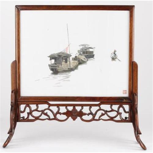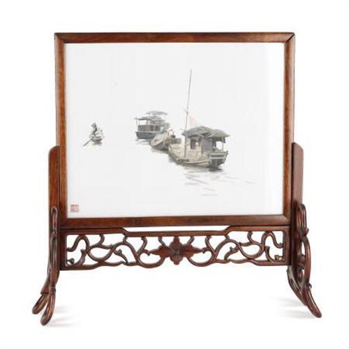 <B>A Chinese Embroidered Panel in Stand<BR></B></I>Unknown maker, China<BR>Twentieth Century<BR>Silk, glass, wood<BR>Signed lower left corner <BR>20 inches high x 20 inches wide <BR> <BR>The double sided screen of white silk embroidered with sampans, in wood frame and stand.<BR><BR><BR><b>Shipping:</b> Requires 3rd Party Shipping (<a target="_blank" href="http://www.heritageauctions.com/common/shipping.php">view shipping information</a>)