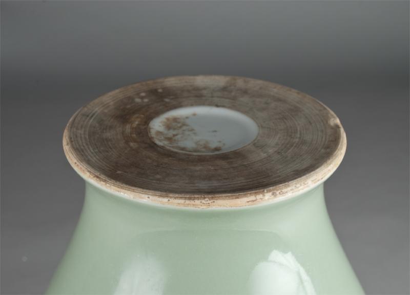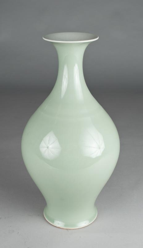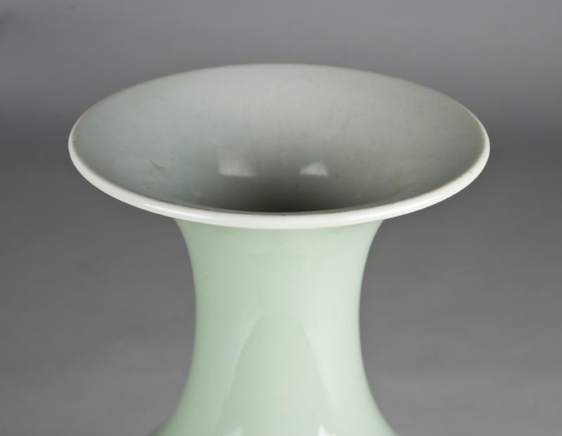 The pear shaped vase with slender neck and open mouth, unsigned, has a wonderful light celadon glaze stopping just short of the foot, 16"H, shallow and old small chip to bottom of foot.