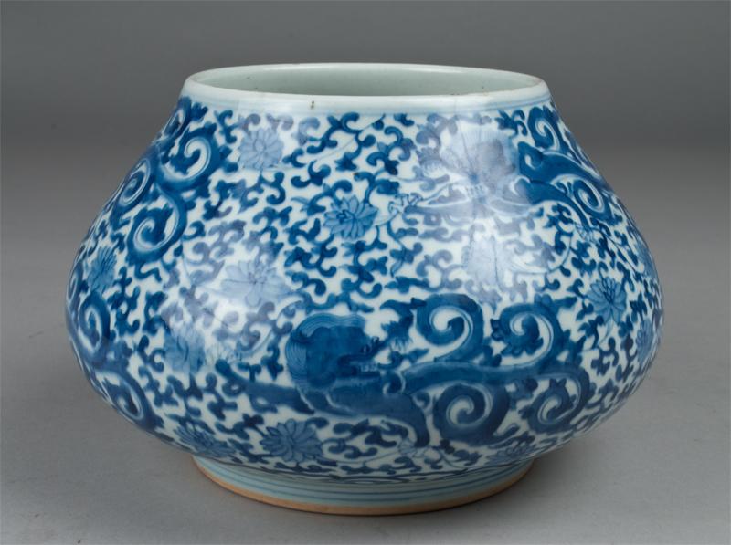 The body profusely decorated with dragons against ruyi clouds, the bottom with two concentric circles in underglaze blue, 9.25"D X 6.375"H.