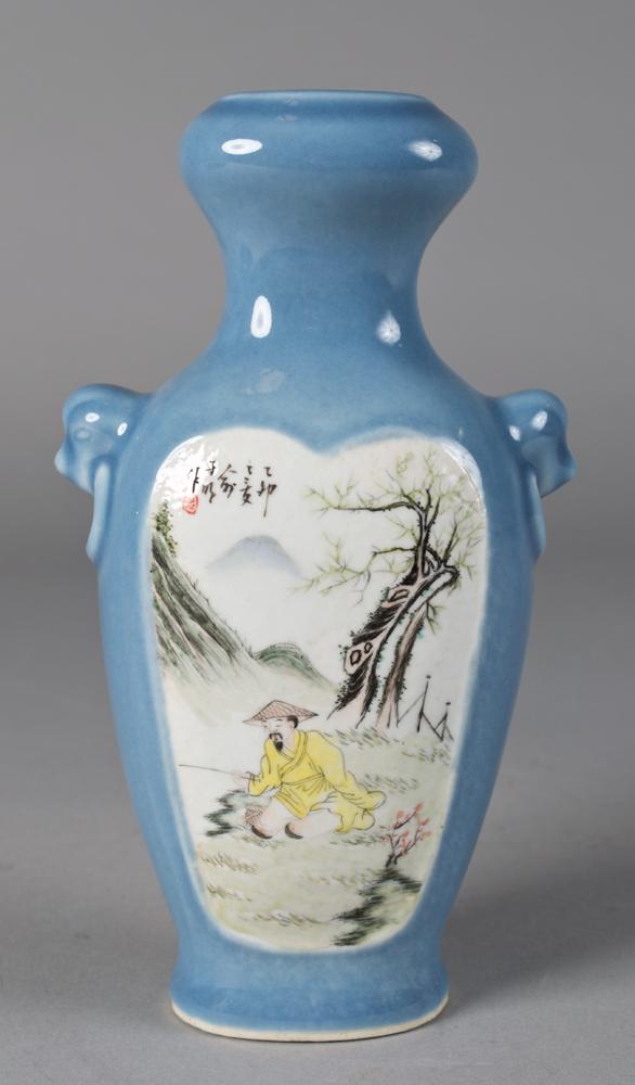 Blue body with animal head handles in simulated rings front and back with two areas of figural scenes each with calligraphy and seal mark, four character mark in iron red on underside, 8"H X 4.1/2W in custom fitted box circa 20th century.