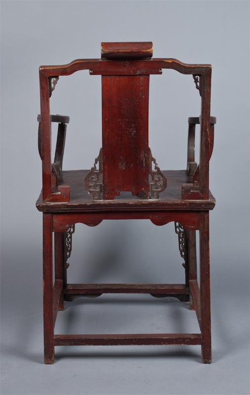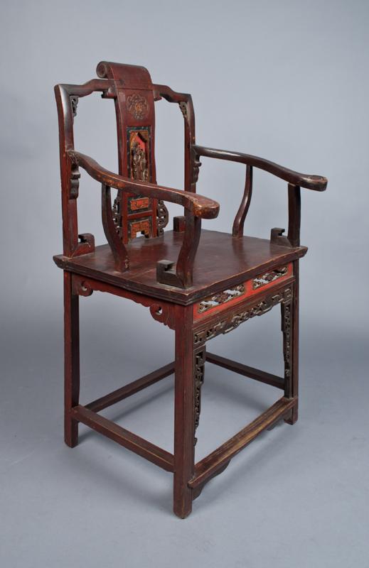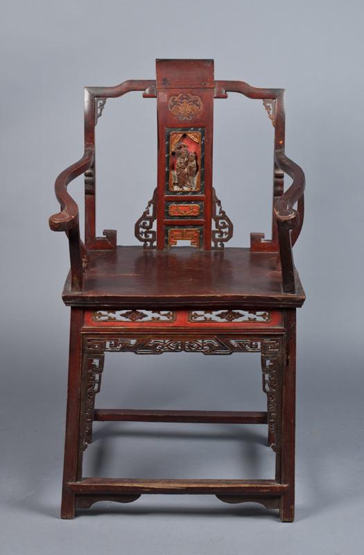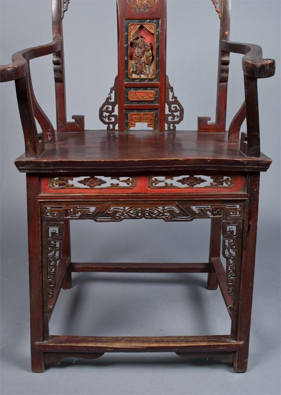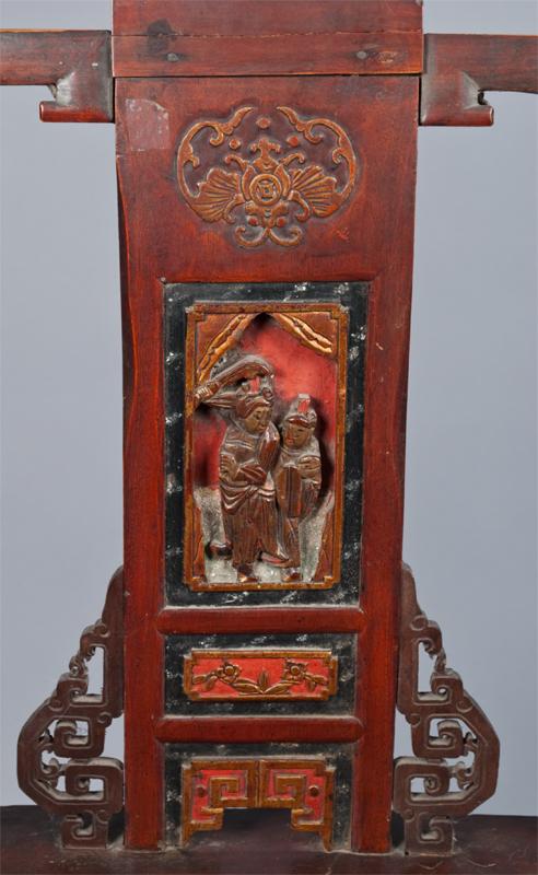 With carved back to depict figures with ruyi shaped arms and carved openwork apron, with painted highlights. 40.5" H x 23" W x 20" D. Circa 18th/early 19th century.