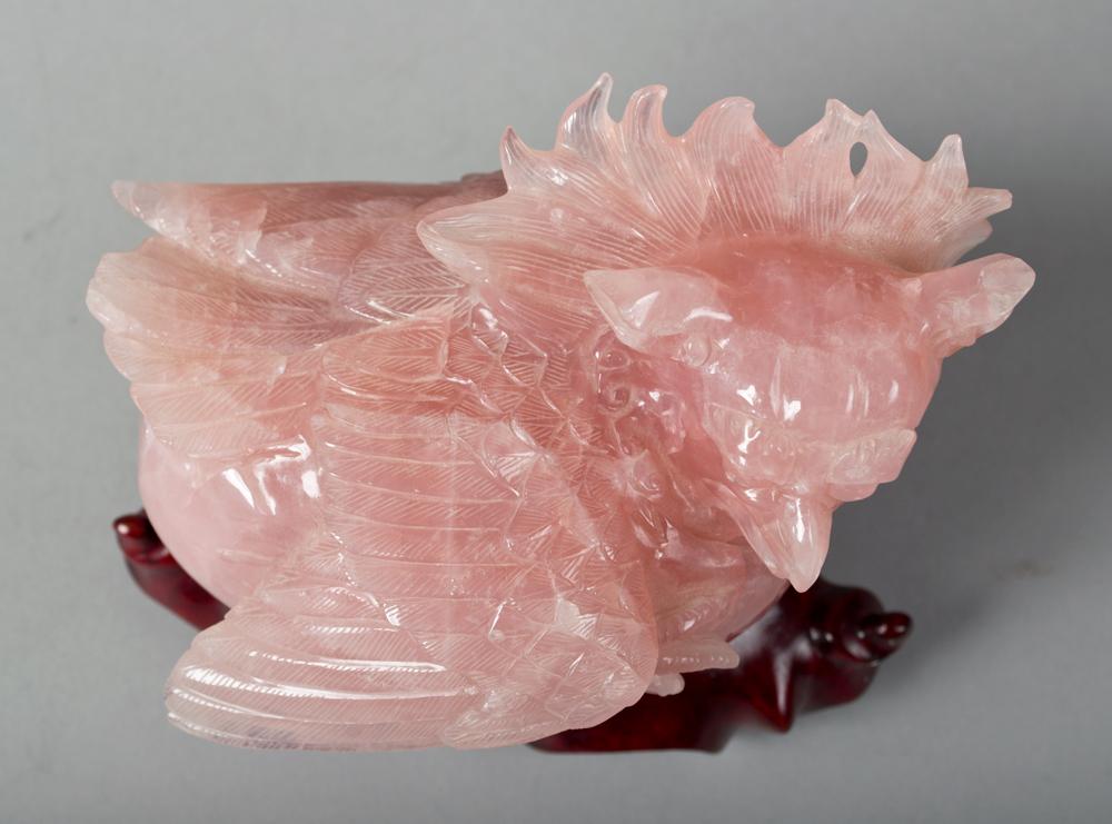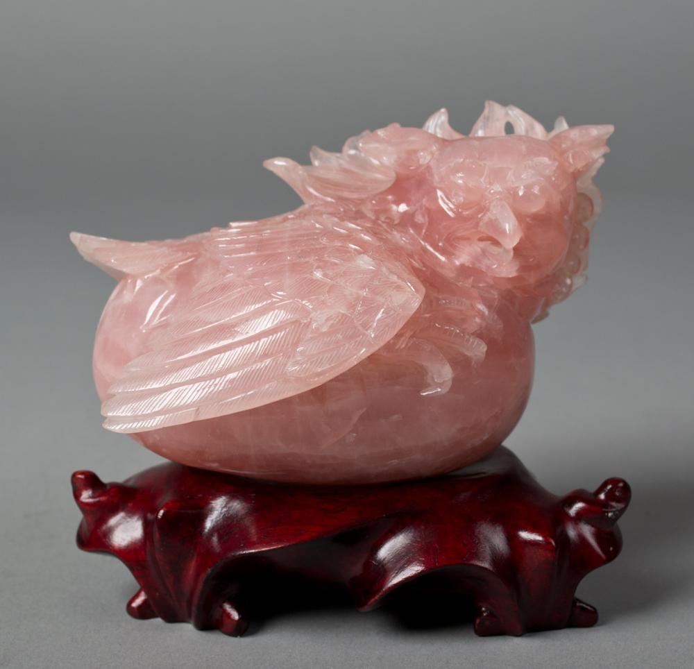 Finely carved to depict a laying bird with horns and ruffled neck feathers on fitted hardwood stand 3.5"H X 4.5"W, not including the stand,very heavy, circa early 20th century.